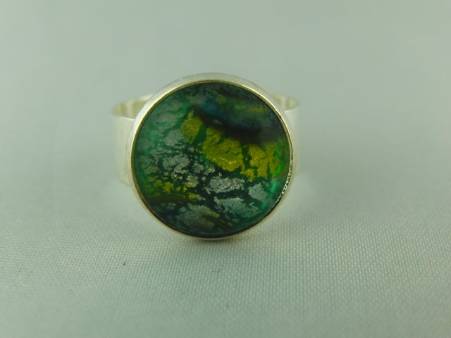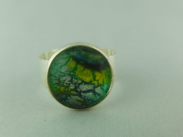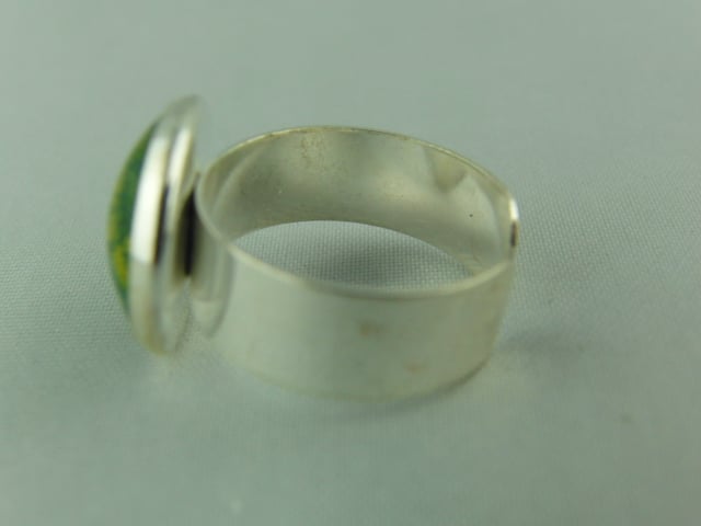 This "mystical" ring has an adjustable base so it will fit most sized fingers and it has a 15 mm round green dragons eye cabochon set on it. The ring base is silver plated.