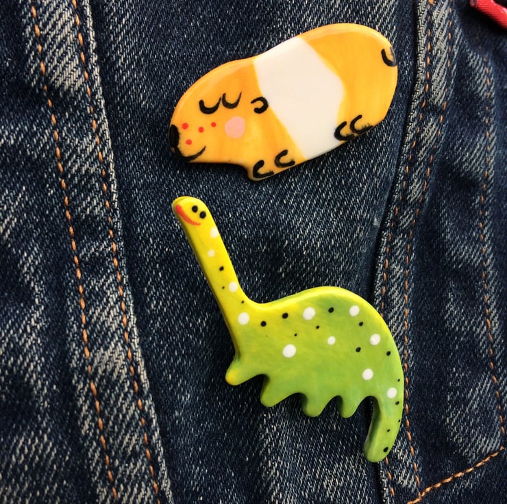 Little guinea Pig badge (4.4x2.3cm)Handmade in porcelain clay.I have cut out the guinea pig shape,biscuit fired,handpainted and glaze fired the guinea pig badge.Finally I have attached a brooch pin to the back with epoxy glue.