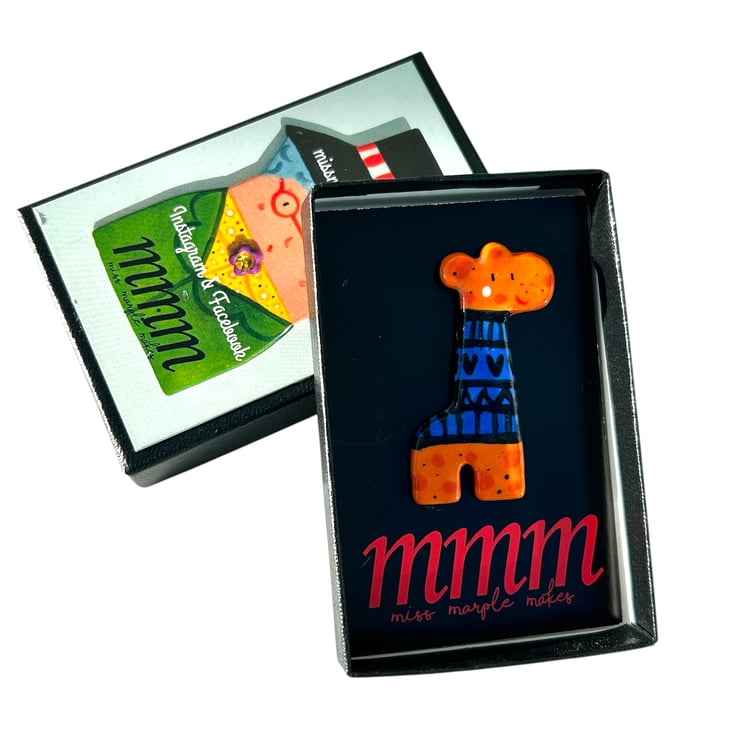 Cute handmade Giraffe badge in porcelain clay. Hand painted with underglaze and fired in my kiln. It would look great on a jacket and as a gift for a friend.(measures 5x3 cm)