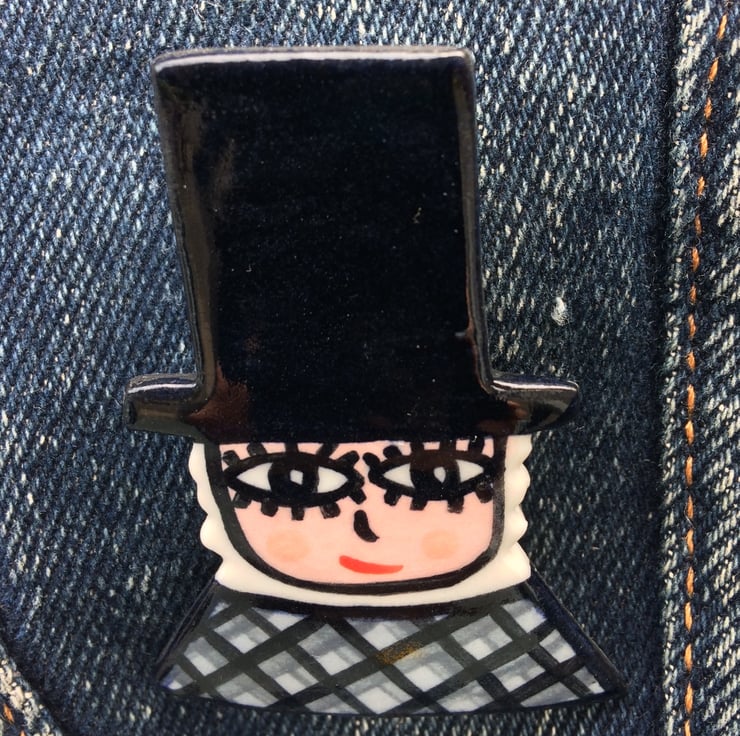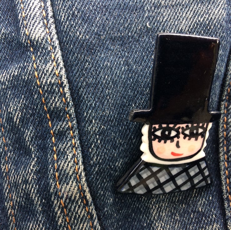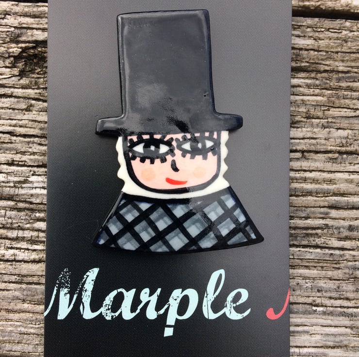 Handmade Porcelain Welsh Lady Brooch (5.3x4cm).I have made a sketch of the Welsh Lady and with a template cut out the shape in clay.This is then dried slowly and biscuit fired followed by me hand painting the face,Hat ,shawl and lace.I have then glazed and glaze fired the Welsh Lady Brooch and attached a silver plated brooch pin to the back.She will arrive in a little black Miss Marple Makes gift box.Great gift for anybody connected with Wales..or who is having Hiraeth (longing)for their motherland!