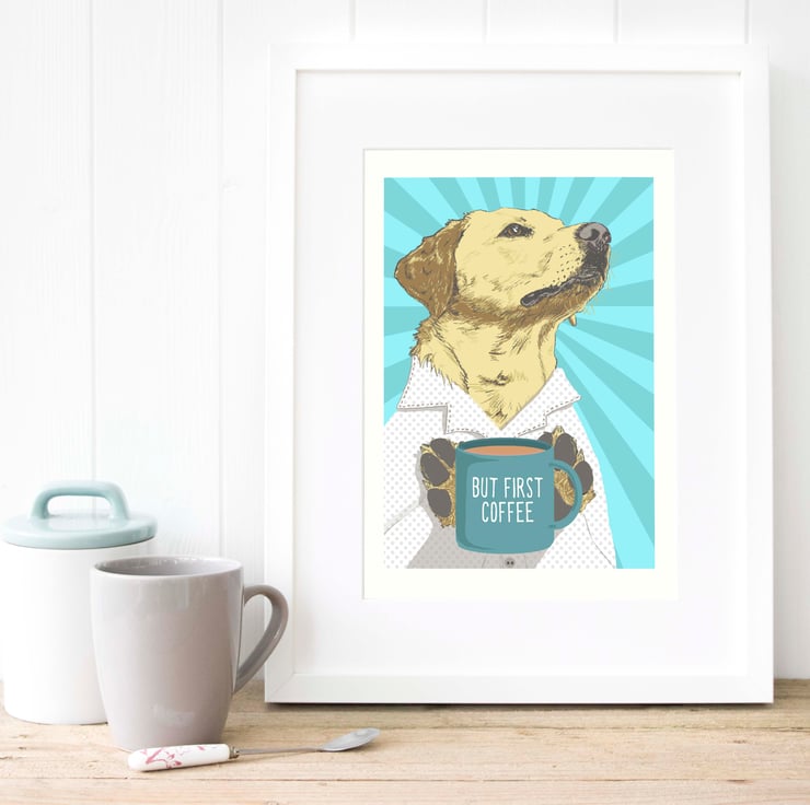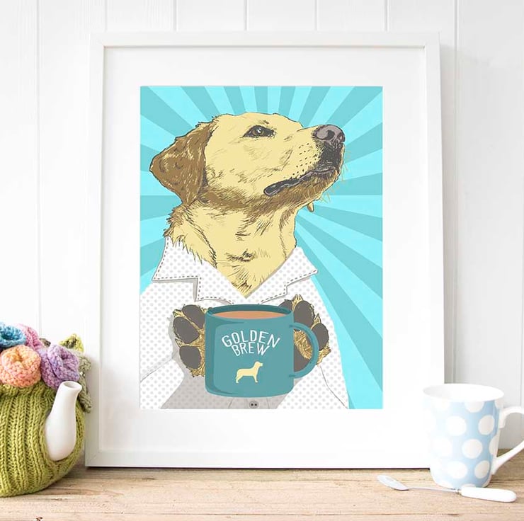 This yellow Lab print will make fabulous kitchen art, coffee shop wall art, cafe art or office decor. The print would be a fun gift for any yellow Labrador owners or dog lovers wanting to brighten up their walls. The gift can be personalised with your own words so a tea print or coffee art? You choose between the words: 'golden brew', 'there is always time for tea' or 'but first coffee' - or have your own logo or words added to the mug at no extra cost. Simply drop me a note at the time of purchasing with your choice.