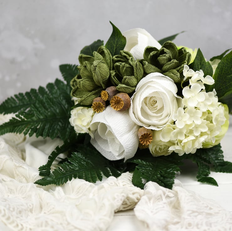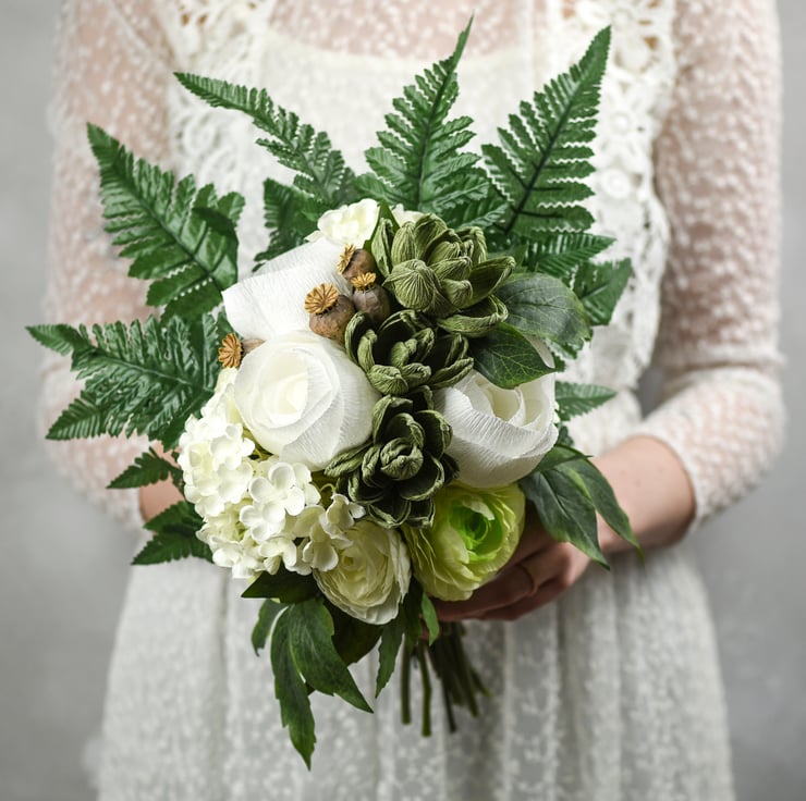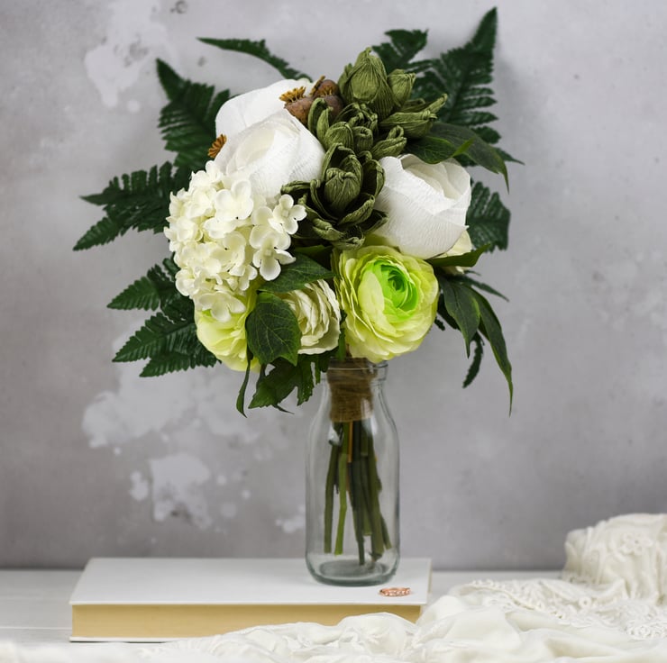 A stunning bouquet of paper Roses, Succulents, faux Hydrangea, Ranunculus, Ferns & dried poppy heads create a collection as impressive as real flowers.