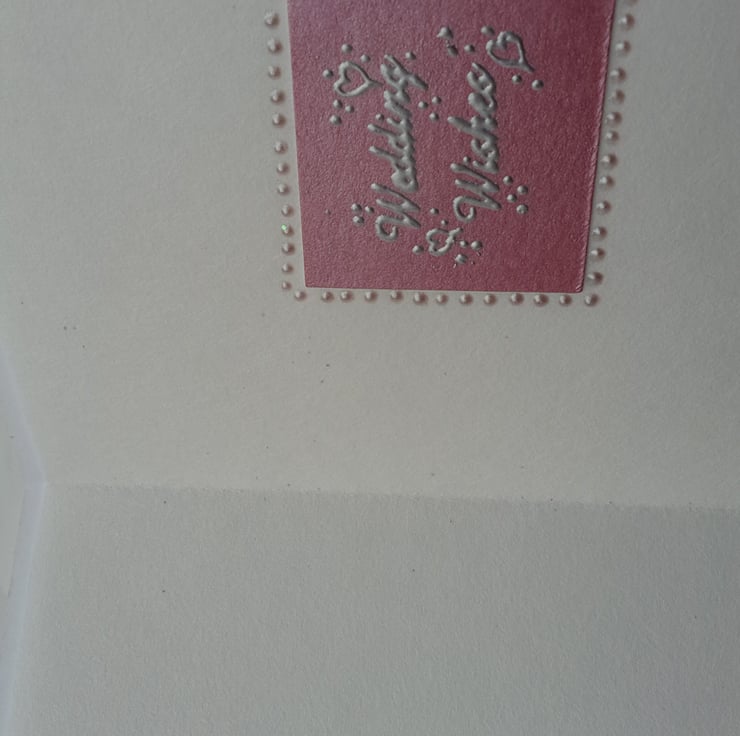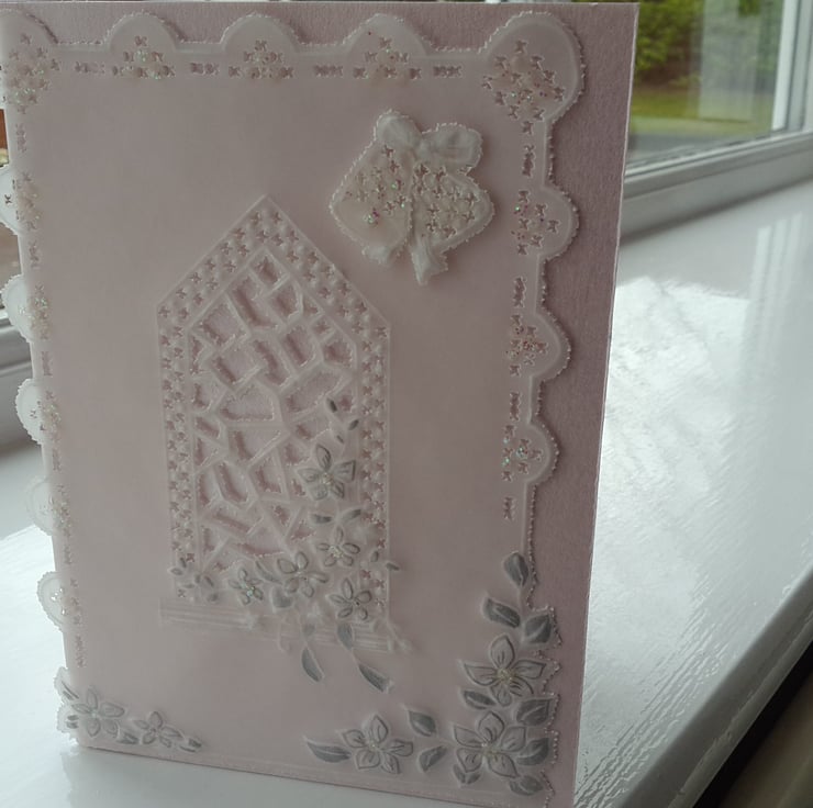 A completely handmade and uniquely designed card. Consisting of parchment which has been embossed cut and pierced into a beautiful church window. The card has a decorative scalloped edging. Finished usher off with silver and fairy g!Utter. Mounted onto pale pink pearl card.