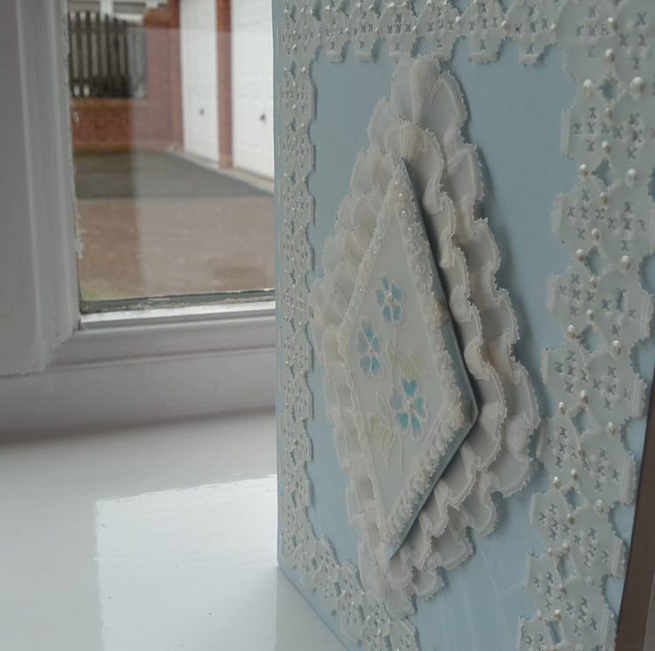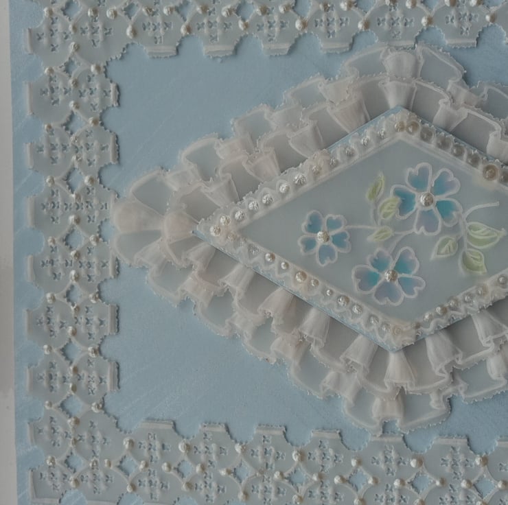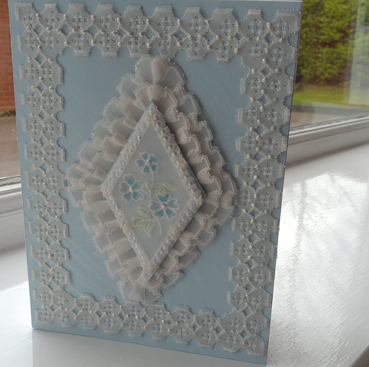 A completely handmade and uniquely designed card. Consisting of parchment which has been embossed cut and pierced into a diamond with pretty posy. The edges have a grilled effect. The edges have a pretty embossed design. Finished off with pearl. Mounted onto pale blue pearl card then onto quality pristine white card.