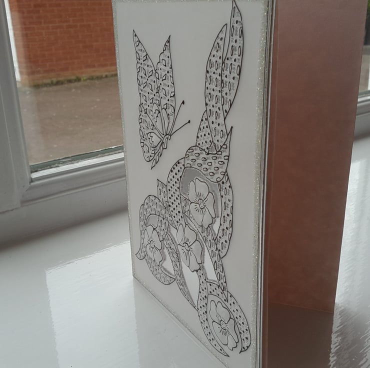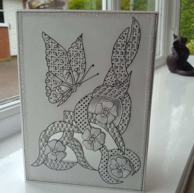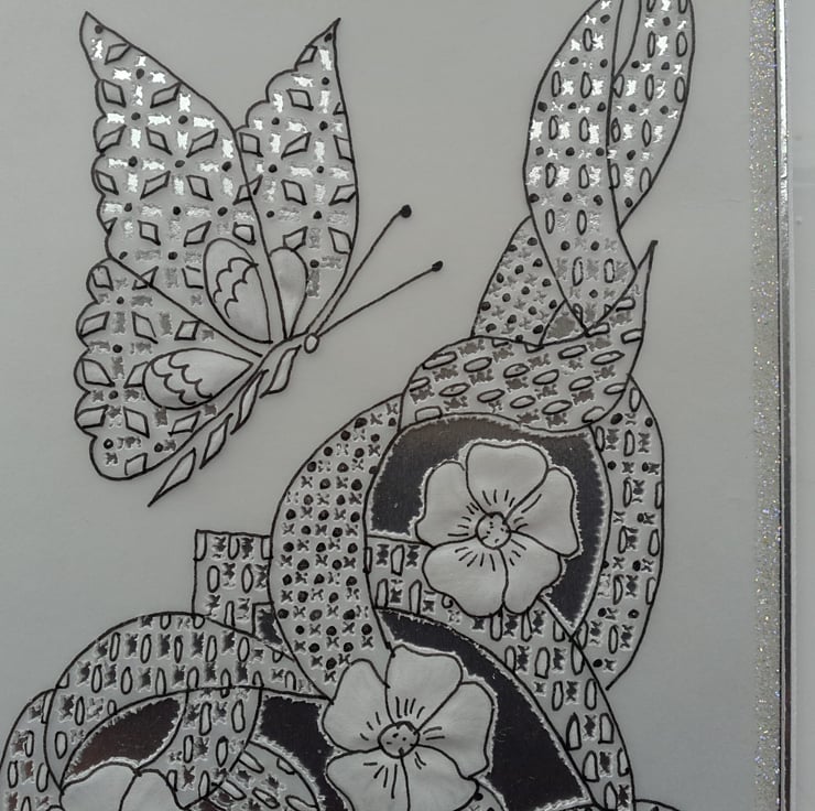 A completely handmade and uniquely designed card. Consisting of parchment which has been embossed cut and pierced into a modern design with flowers and butterfly. Edges in fairy glitter. Mounted onto silver mirri card then onto quality pristine white card.