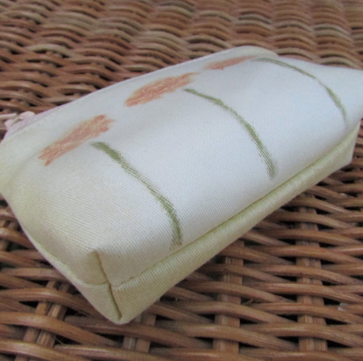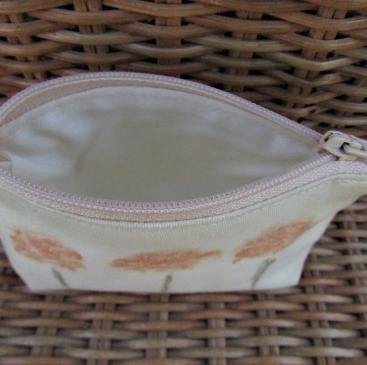 A handy small purse in pale yellow fabric with a floral print pattern featuring three stems of peachy orange flowers. The coin purse has a cream zip and is lined with cream fabric. The base of the purse is boxed to give a spacious interior.