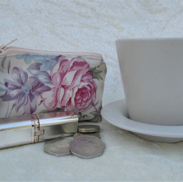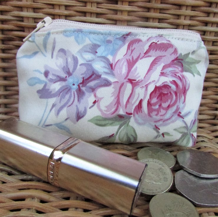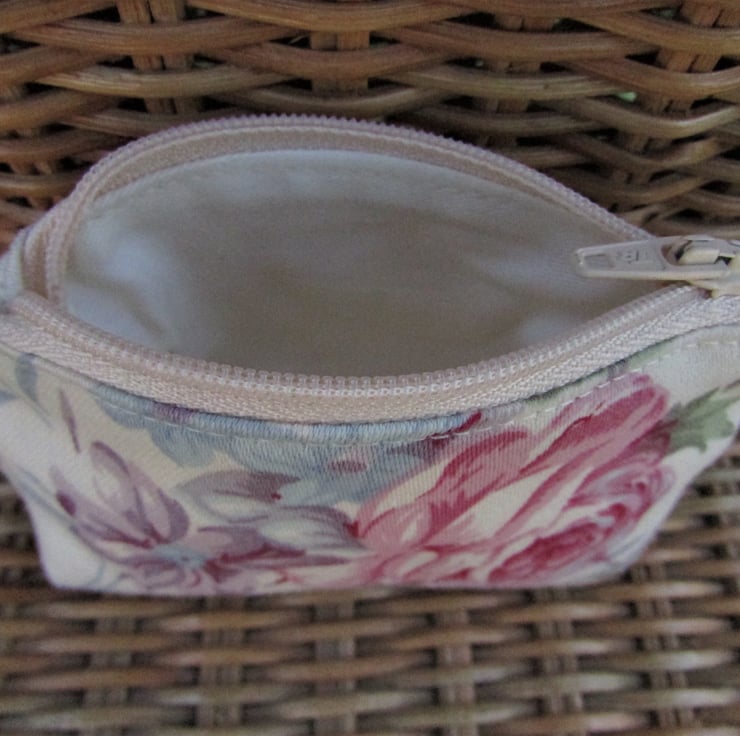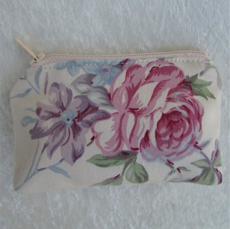 A delightful small purse in cream fabric with a floral print pattern featuring a pink Rose and purple and blue flowers. The coin purse has a cream zip and is lined with cream fabric. The base of the purse is boxed to give more space inside.