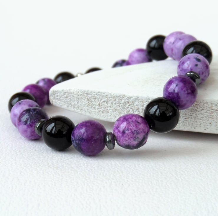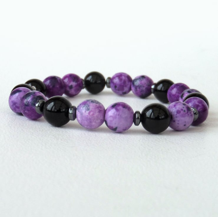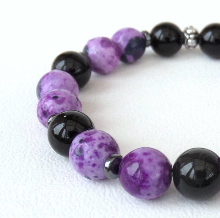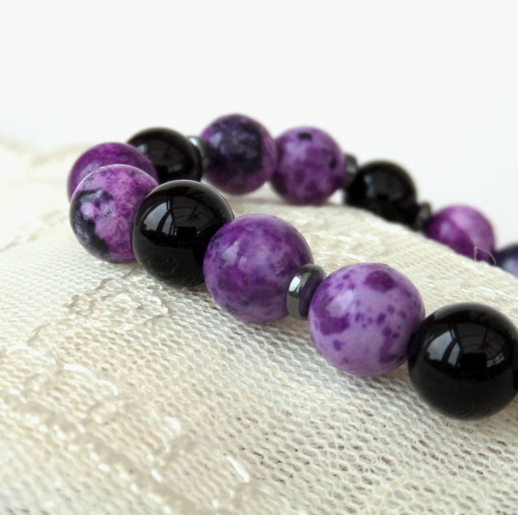 Beautiful purple and black casilica gemstone beads are mixed with shiny black onyx in this unique bracelet.