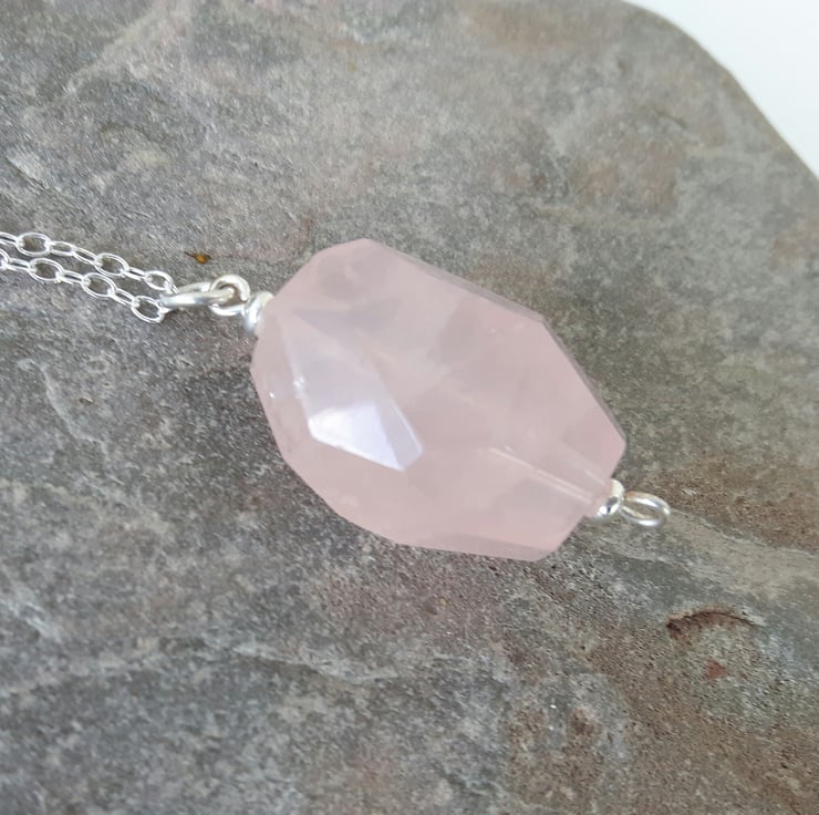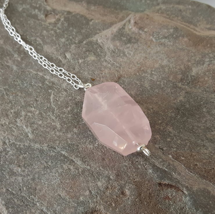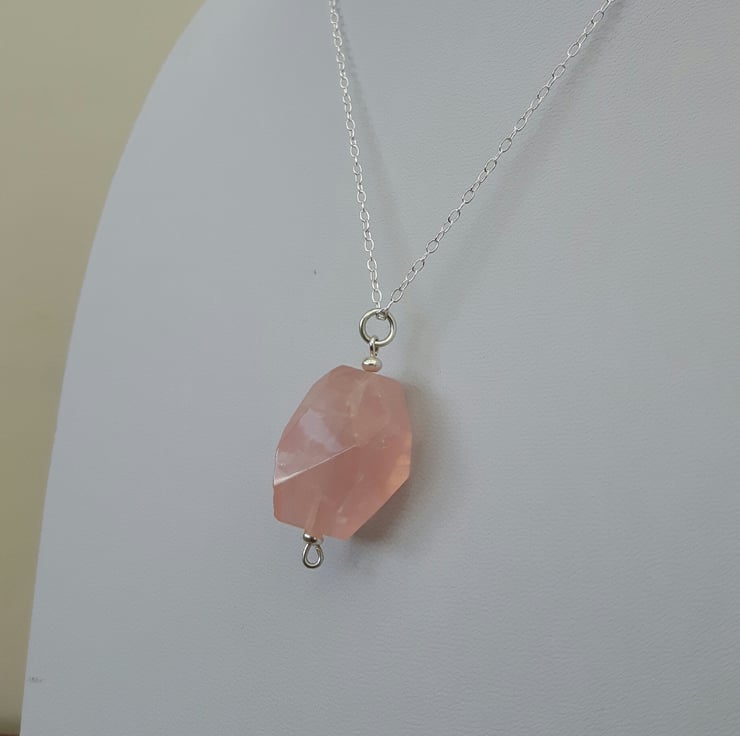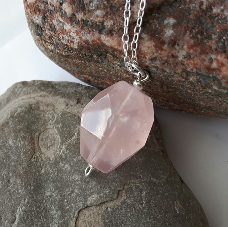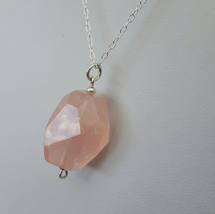 This pretty pendant necklace features a chunky faceted dropper gemstone of semi-precious rose quartz. It is a delicate pale pink in colour, semi-translucent and sparkles in the light. This is a perfect gift for someone who loves the natural look of crystal. i have mounted it between two small sterling silver beads and it hangs from a sterling silver trace chain with a bolt and ring clasp, stamped '925' to indicate purity. The gemstone measures 2.4 x 1.6 x 1.0cm and the chain is 18in/45cm in length. Please contact me if you would prefer a different chain.