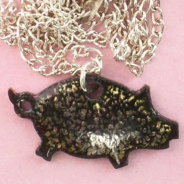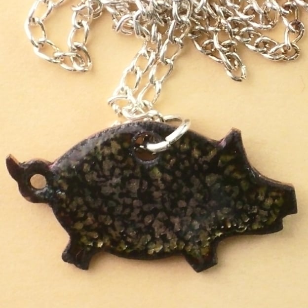 I made the pig by firing a coat of black enamel over several layers of clear enamel. The copper base shows through the black in tones of golden brown, shimmering as the light striking the pendant shifts.