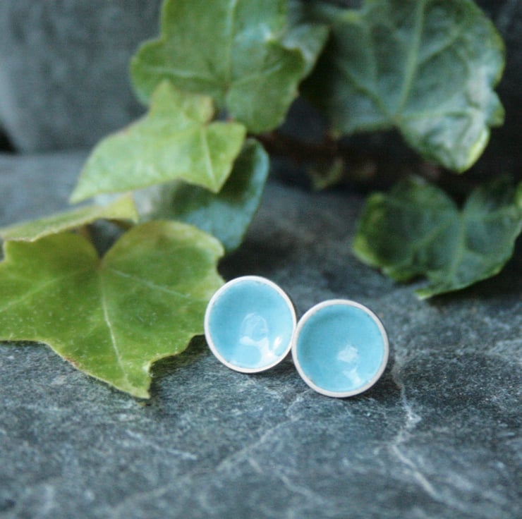 These handmade sterling silver stud earrings measure 10mm and are enamelled with a pale blue enamel. I have soldered sterling silver ear posts to the back.
