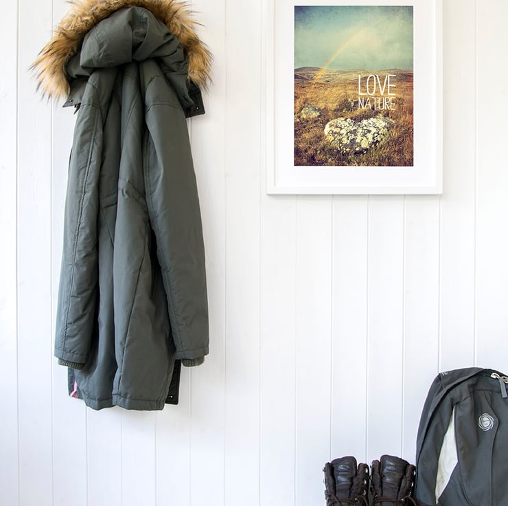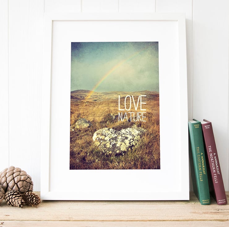 This nature lovers typography print captures a love heart shaped rock, rainbow and the quote 'Love Nature'. The original photograph was taken in the Autumn in the Glen Affric region of Scotland. This print comes beautifully packaged making it a great gift for hikers and a fab choice if you're looking for nature wall art or autumn colours to complement your rustic decor.