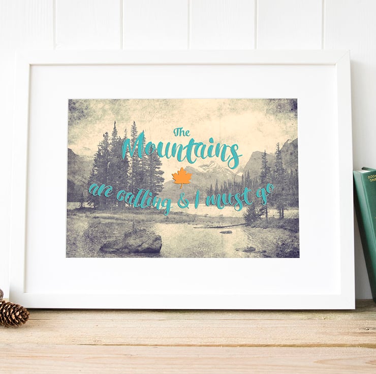 This listing is for a typography print featuring the John Muir quote 'The mountains are calling and I must go'. This mountain print would look fab in rustic decor setting, lakes houses and sits just as well in contemporary homes. This mountain wall art print is archival quality and comes beautifully packaged making it an ideal gift idea.