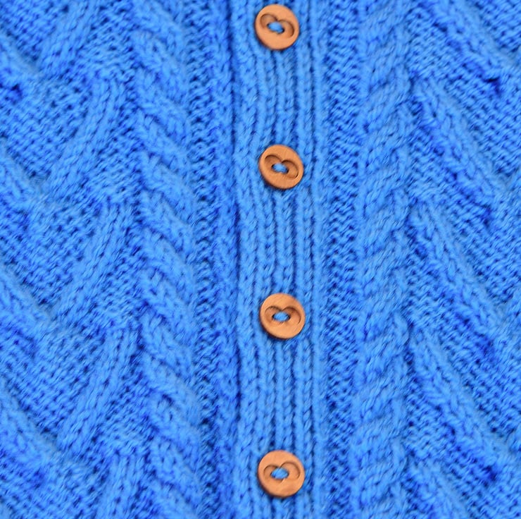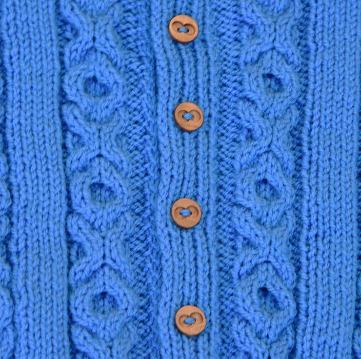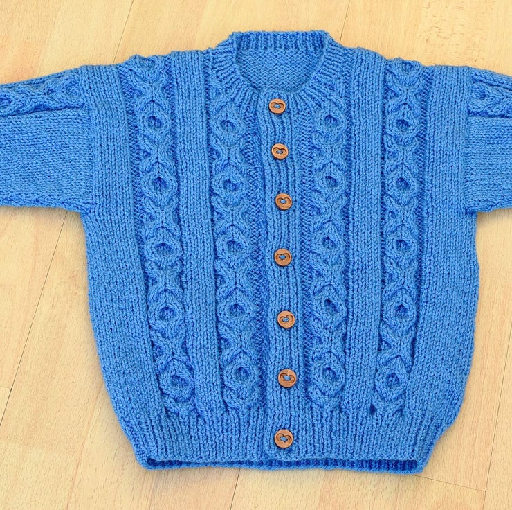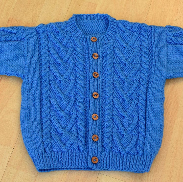 hand knitted aran style cardigan to fit approx. age2 to 3 in a lovely cornflower bluewith a pattern on fronts and sleeves.