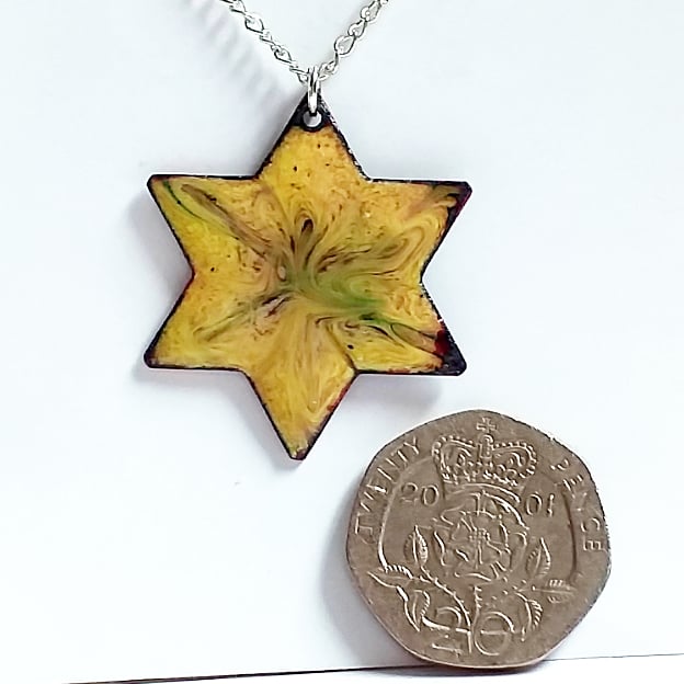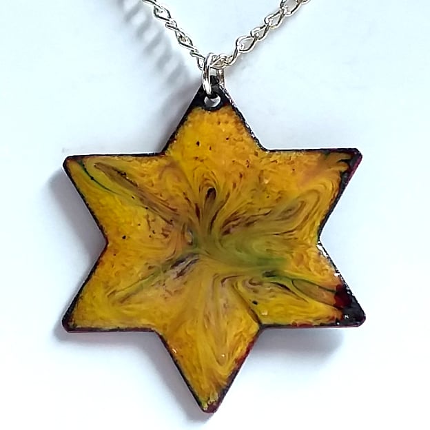 Rods of blue enamel scrolled over over the yellow base coat decorate this six-pointed star pendant. In places the blue has merged with the yellow to generate a green shade. The copper base shows through the yellow in tones of golden-brown, depending on the direction of light striking the pendant.