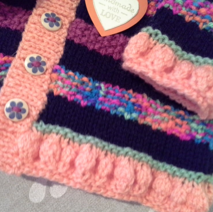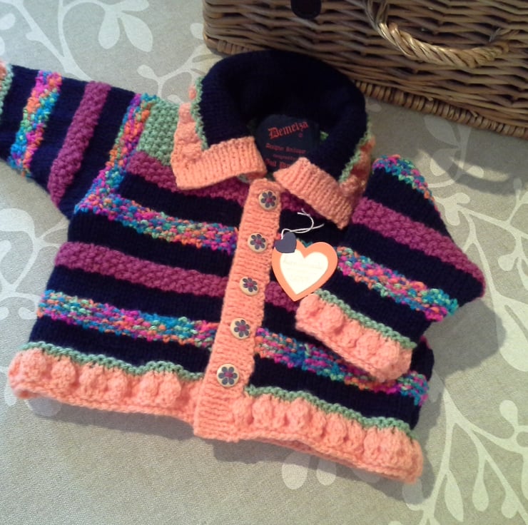 An eye catching baby jacket hand knitted and designed using quality branded machine washable British and French yarns. The buttons are made from genuine wood with a delicate flower design on them. The collar is wide with a ruffle effect around the edge to match the sleeves and bottom bodice. The jacket has the branded designer garment label attached to the back neck edge with the care instructions woven within it for lasting reference.