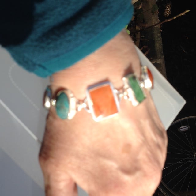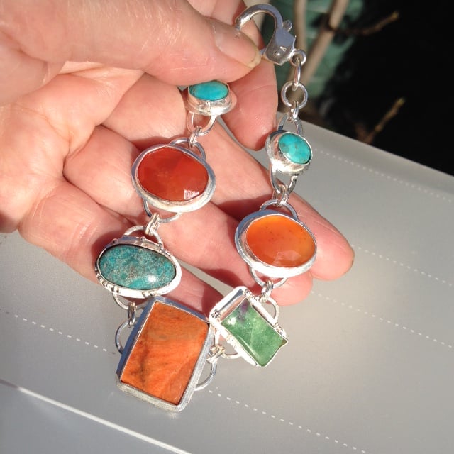 With its brightly coloured stones this bracelet is like a walk in a Summer garden. Containing Apple coral, American turquoise, Carnelian and Ruby in Zoisite this is a one of a kind bracelet. It has a cute but secure handcuff clasp and measures 8 inches or 20.25cm altnough it can easily be made smaller by fastening into the loops between stones.