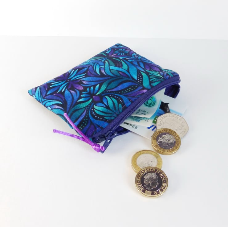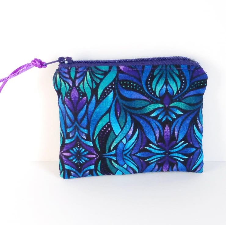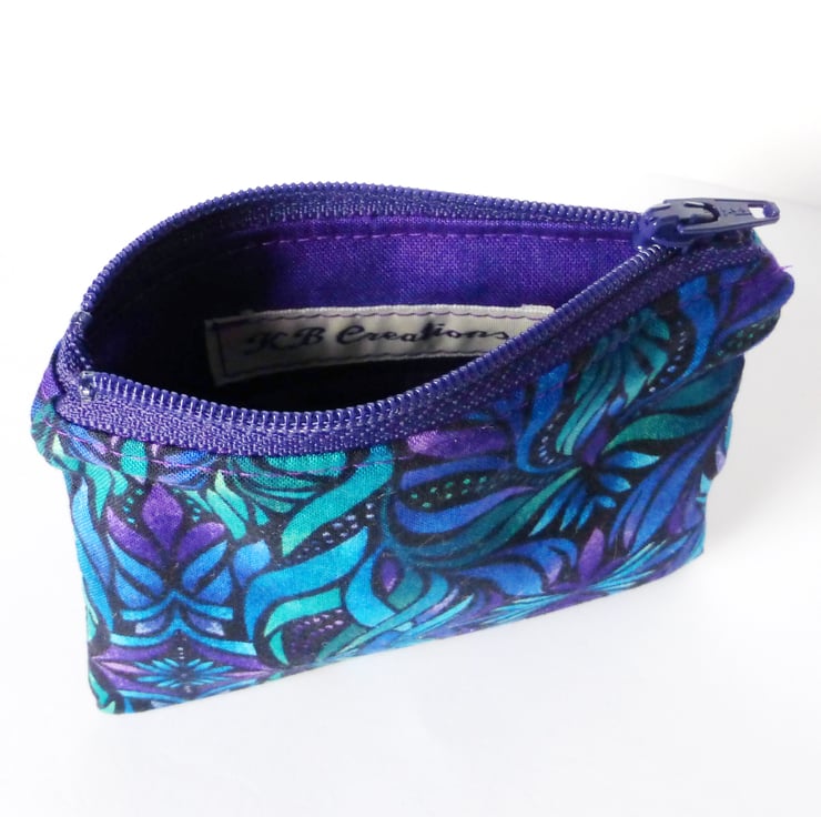 A coin purse made from 100% quilting weight cotton in a lovely multi coloured pattern in mainly blues and purples on a black background.