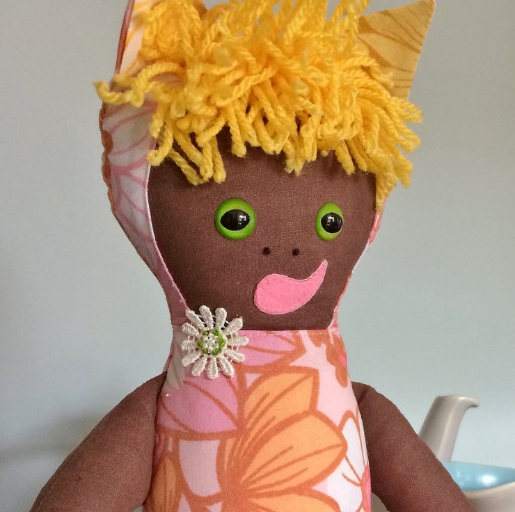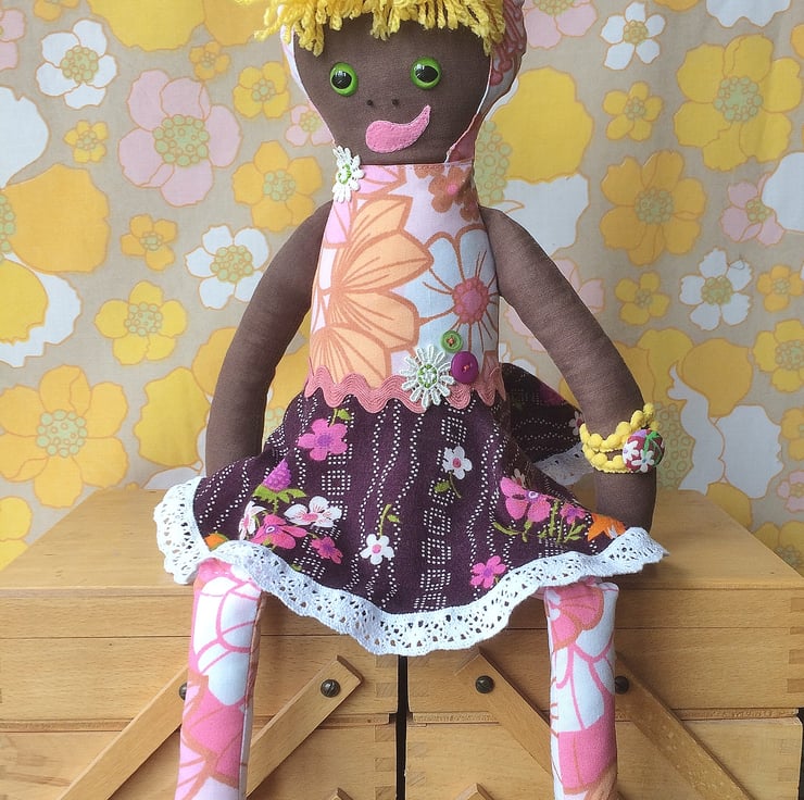 She is made from vintage fabric , various trimming and 100% polyester filling which conforms to BS1425, BS5852 and EN71 parts 1,2 & 3. She has small parts that although securely sewn could theoretically could pose a choking hazard - buttons, beads, plastic safety eyes and plastic weighting beads ( in a sachet inside to weight her so she sits up ) . NOT suitable for little ones so keep out of reach of small children and pets.