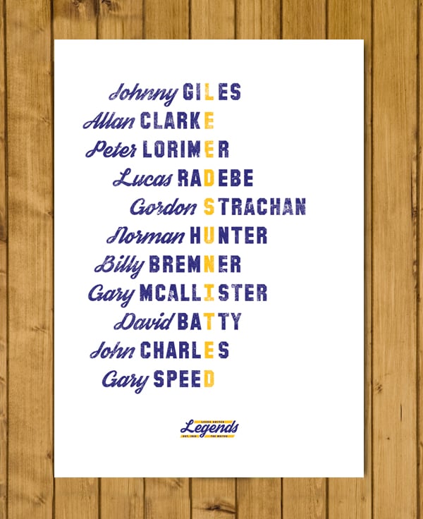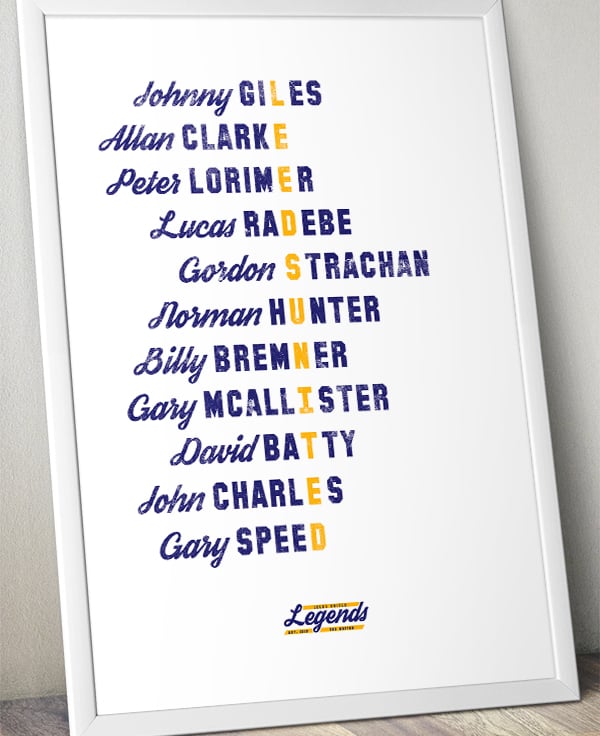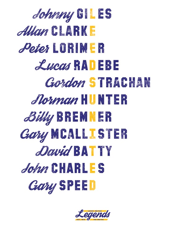 This edition of the Legends series shows the many stars who have pulled on the famous white shirt of Leeds United, who in turn spell out the famous club name.