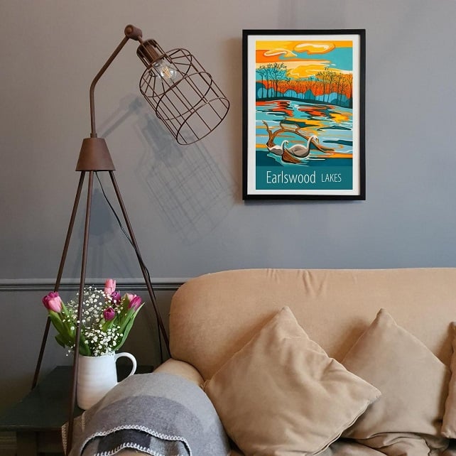 A contemporary travel poster style print of Earlswood Lakes, near Redhill, Surrey, from my own original acrylic painting.