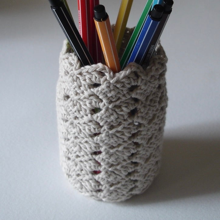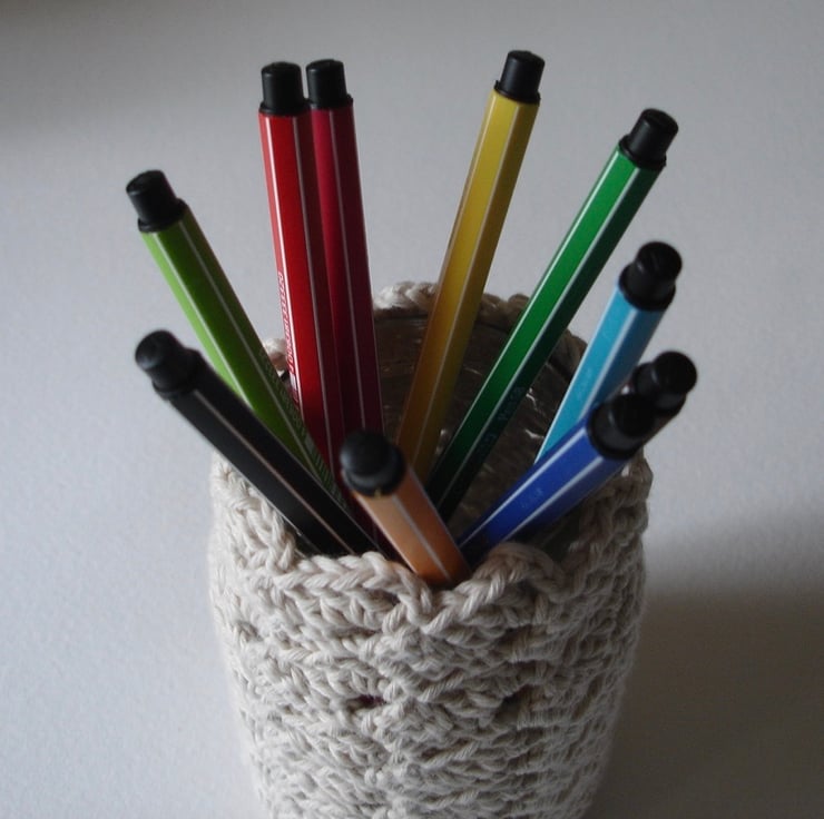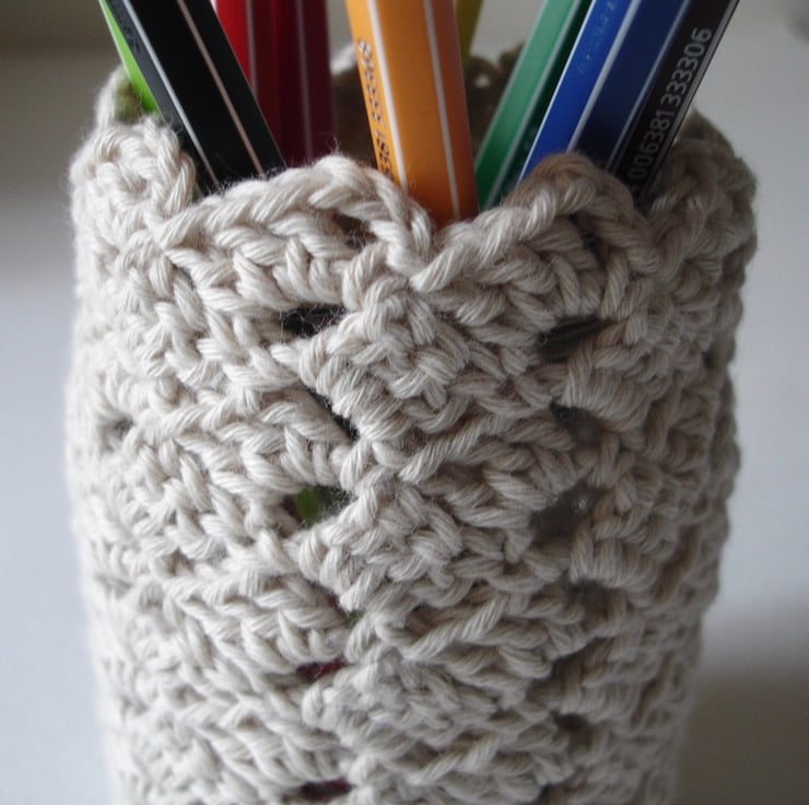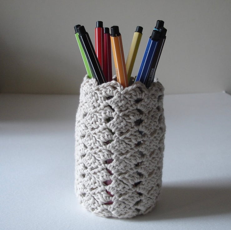 This cute cream crochet pen jar is a repurposed glass jar covered with a handcrafted crochet cover, perfect for keeping any desk organised. A great office accessory. It is made using a fantastic and unusual pattern in this lovely organic cotton yarn. Great for keeping your pens and pencils tidy. This pen holder would double as a really cute fabric vase.