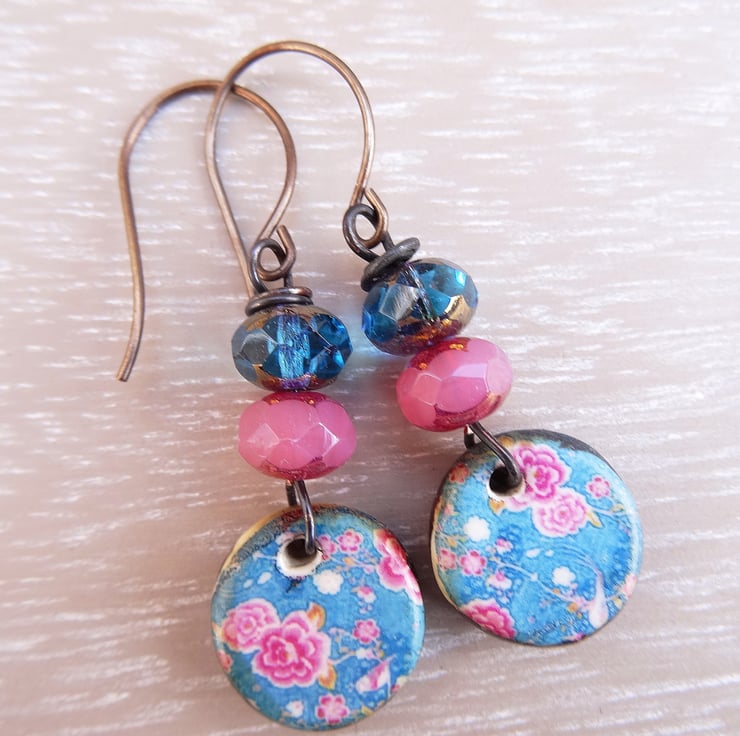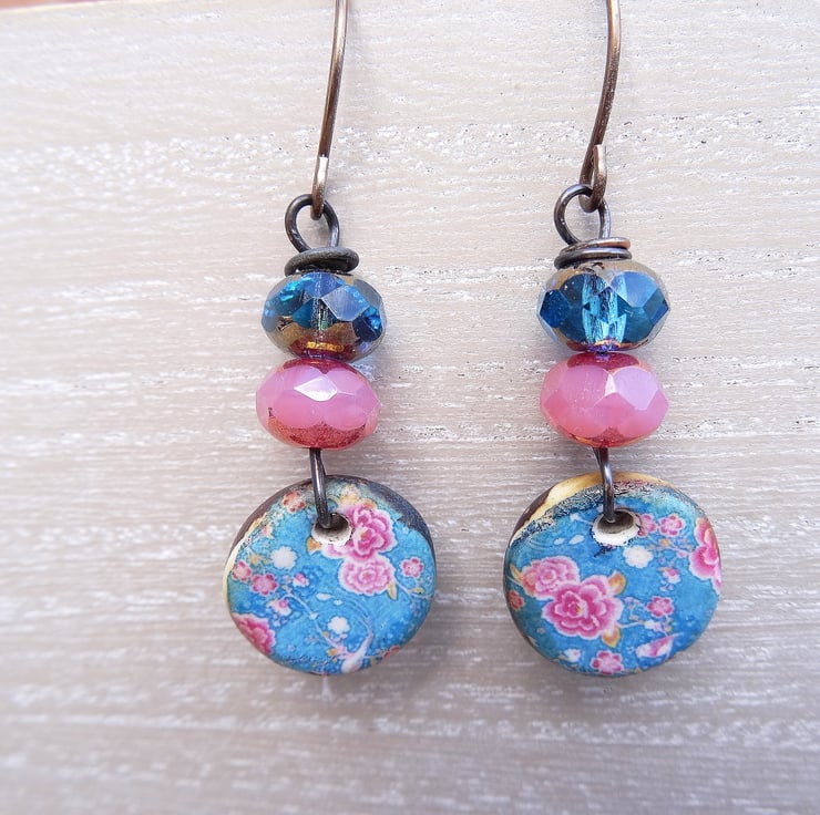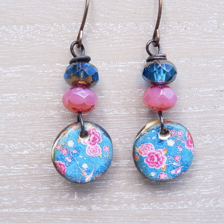 These are lovely, summery earrings made with ceramic round droppers by artisan Natalie McKenna of Grubbi Ceramics. They have a beautiful floral pattern in periwinkle blue and rose pink. To these I have wired 9 x 6mm czech glass rondelle beads also in periwinkle blue and rose pink. The earrings measure 2 inches (5 cm) from top of vintaj brass, nickel free, round loop earwires. As all of the items in my shop are unique, individual pieces made by myself, these are the earrings you will receive. They will arrive gift wrapped in tissue paper and a organza bag.