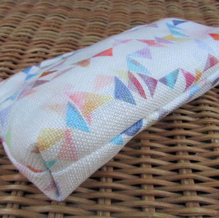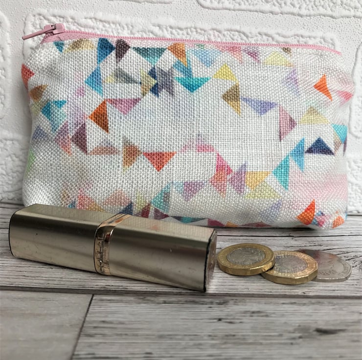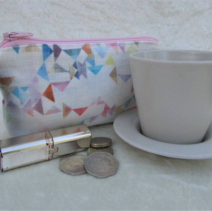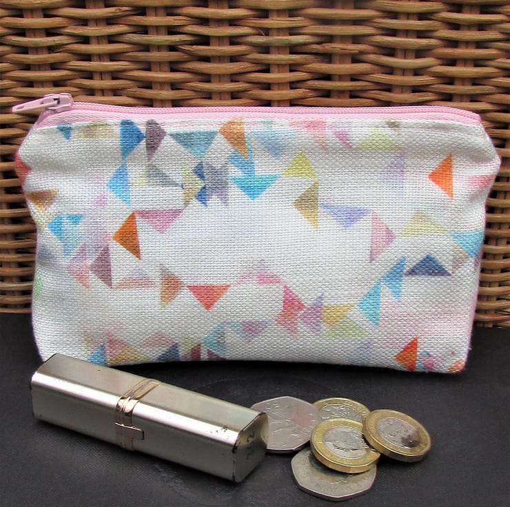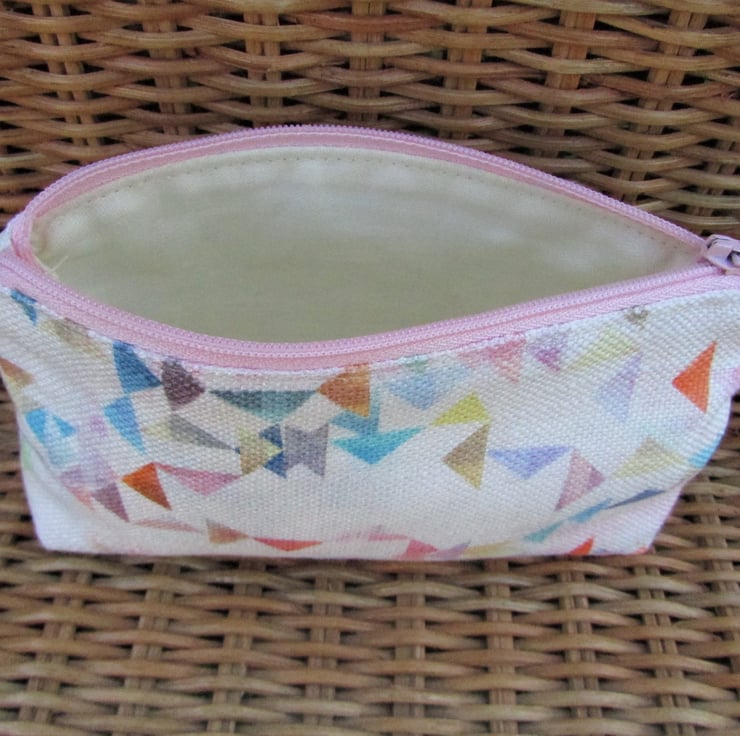 A large purse in white fabric with a pretty print pattern of small multi-coloured triangles. The coin purse has a pale pink zip and is lined with cream fabric. The base of the purse is boxed to give extra room inside.