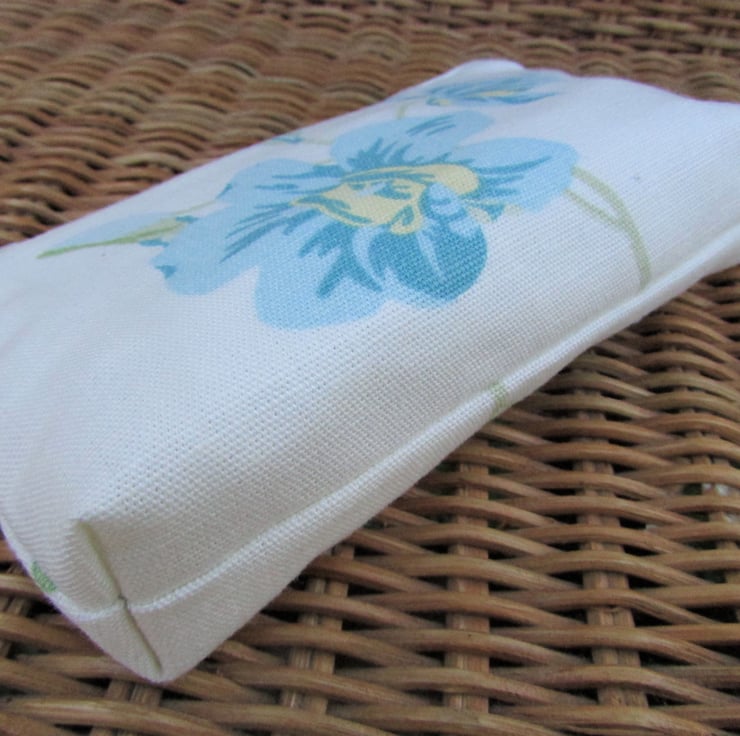 A large purse in ivory fabric with a pretty print pattern of pale blue and yellow flowers. The coin purse has an ivory zip and is lined with cream fabric. The base of the purse is boxed to give extra space inside.