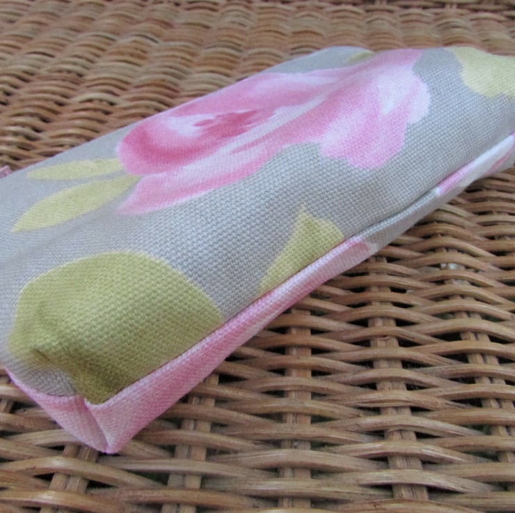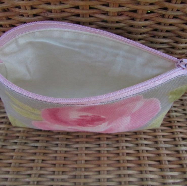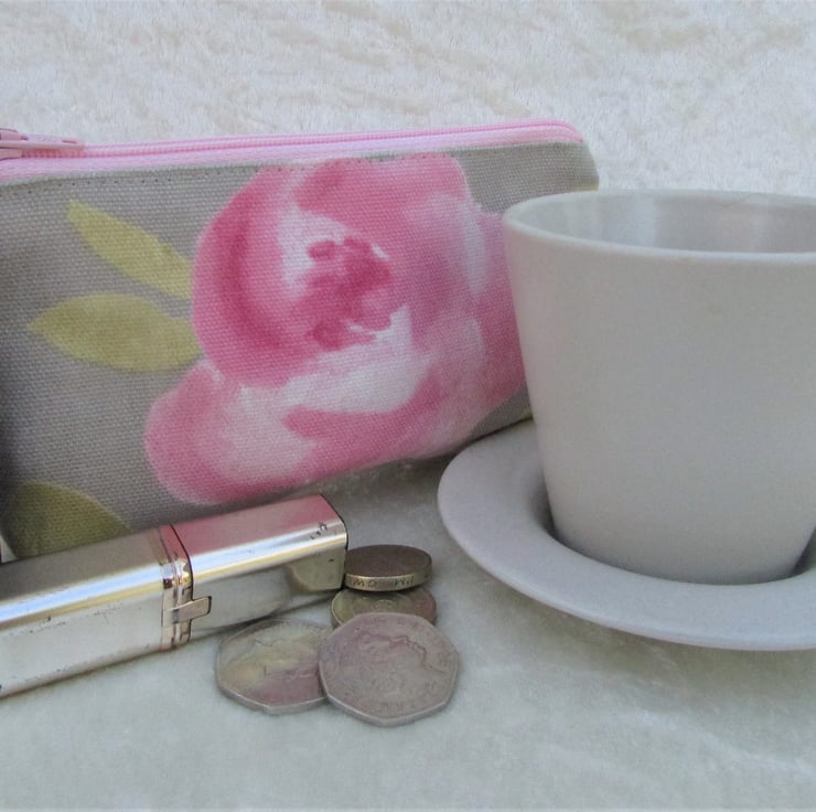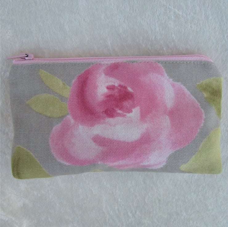 A large purse in a beautiful pale grey fabric with a pretty print pattern of a pink Rose and green leaves. The coin purse has a matching pale pink zip and is lined with cream fabric. The base of the purse is boxed to give a spacious interior.