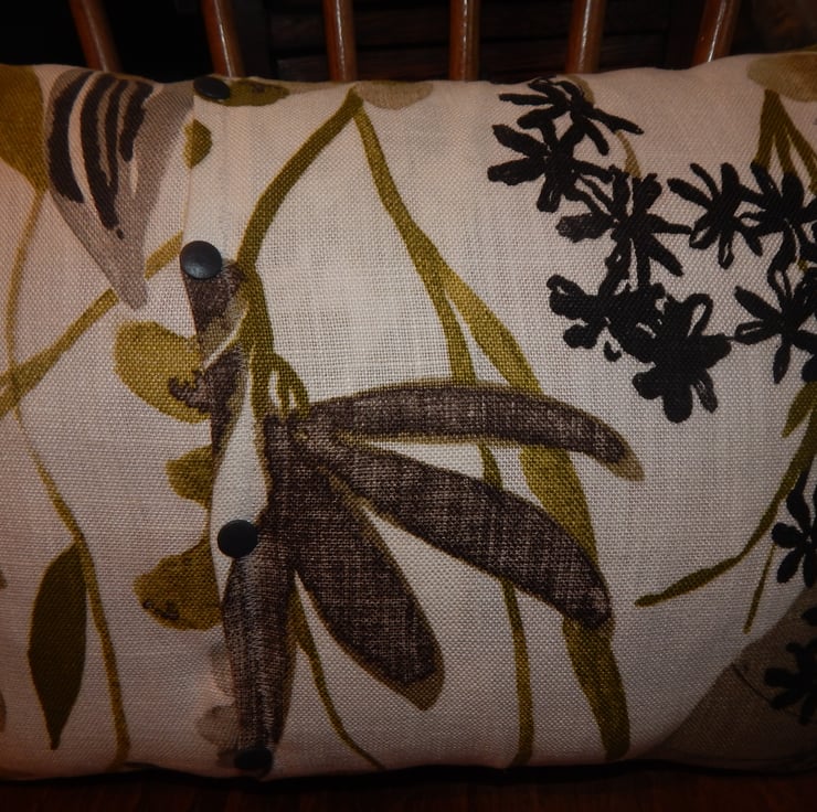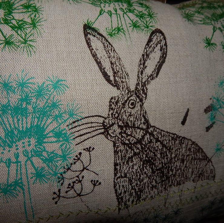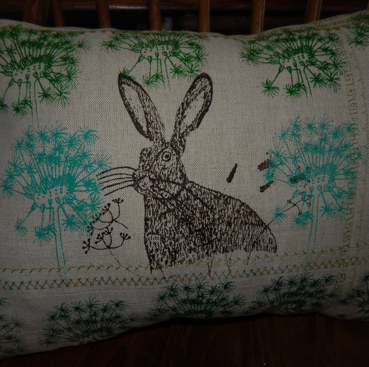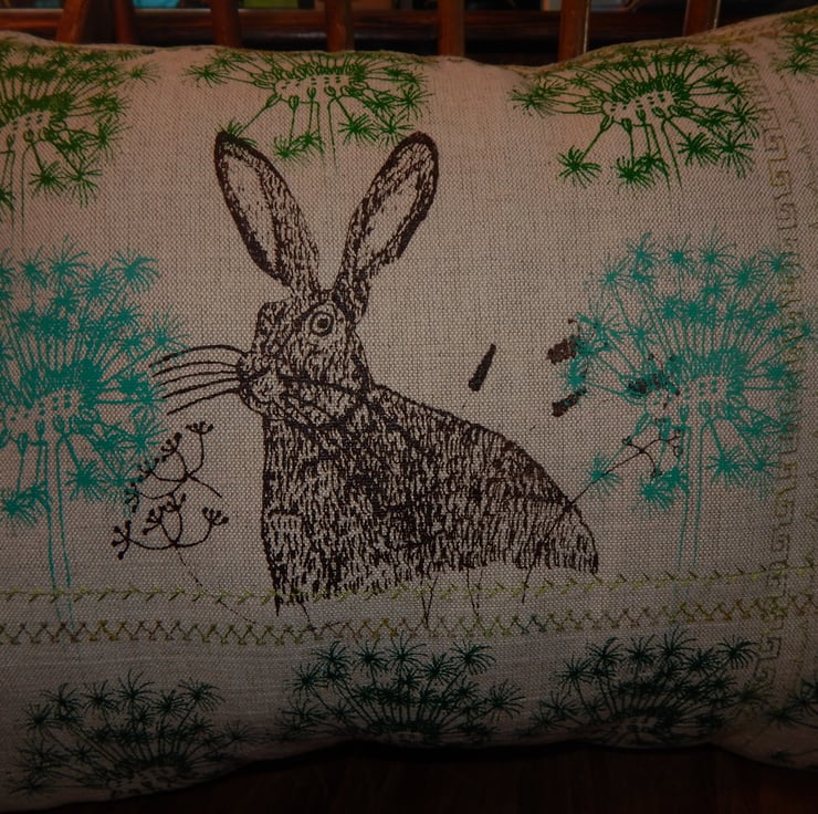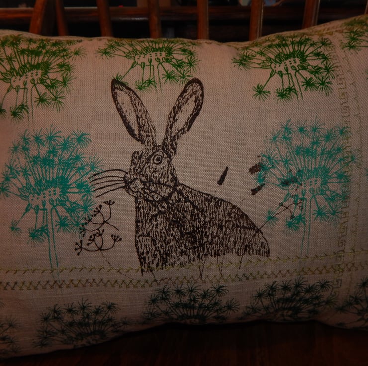 This is a cushion that I have screen printed and made myself. The inner cushion is made from hollow fibre filling. The front of the cushion is screen printed with dandelion clocks in various shades of green with a dark brown hare and wild grasses printed in the middle. I have machine embroidered decorative stitching in green vertical and horizontal areas of the cushion. The reverse of the cushion has a green foliage pattern on cream.
