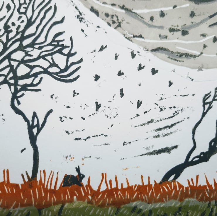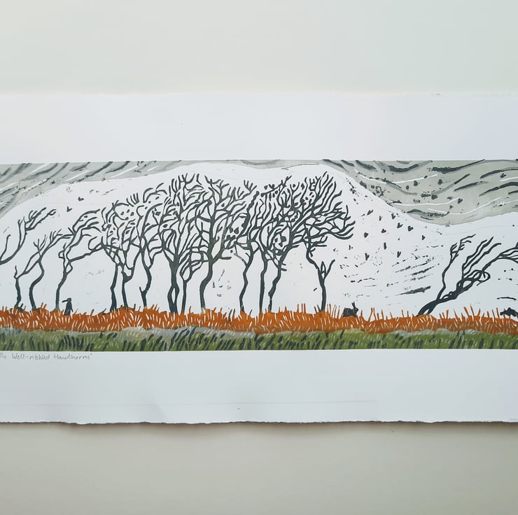 Firstly I draw the image onto a piece of lino. Then I carefully carve it out, (loosing the odd finger in the process) before inking it with hand rollers using linseed oil based printing inks. It is then placed flat on my press, covered with Somerset Satin paper and the mangle like roller of the press is turned...