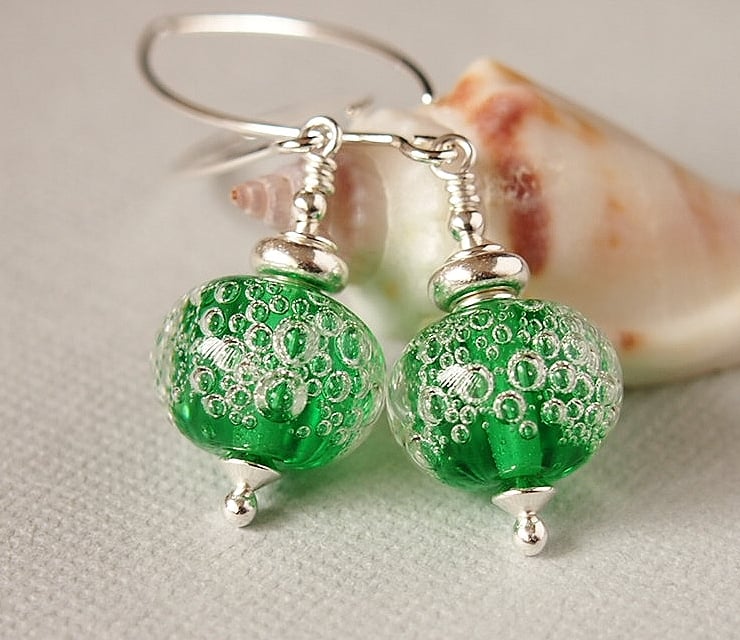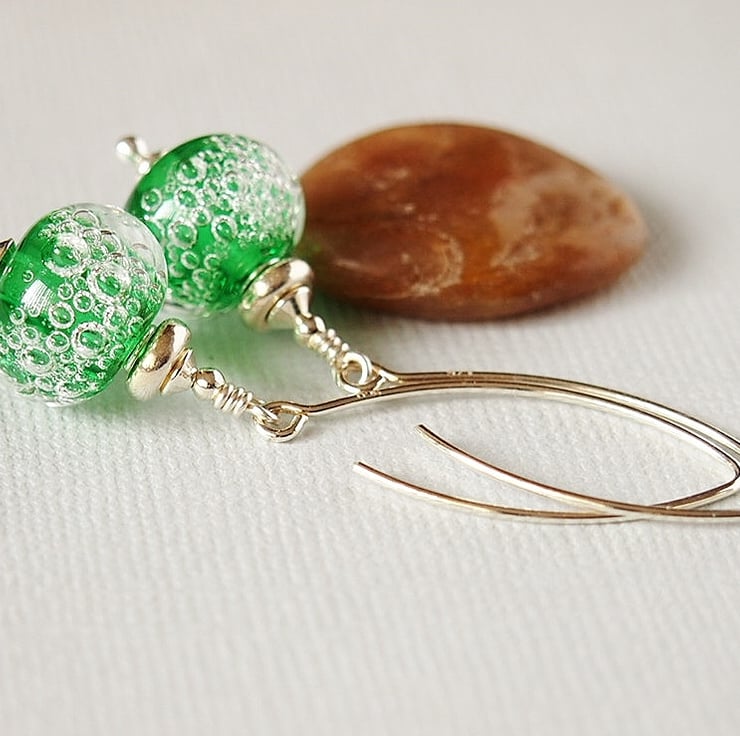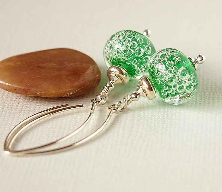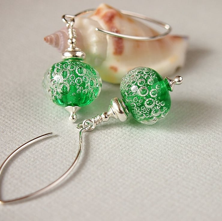 Lampwork glass bead earrings featuring green bubble lampwork glass beads handmade by UK glass artisan Sue Doran of Sooz Beads, are so clear and pretty. They have a gin bottle green core with bubbles all encased in clear glass for added depth and shine, and have been complimented by sterling silver beads, headpins and ear wires.