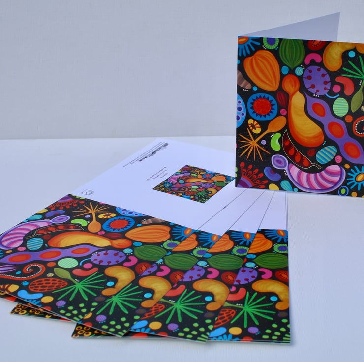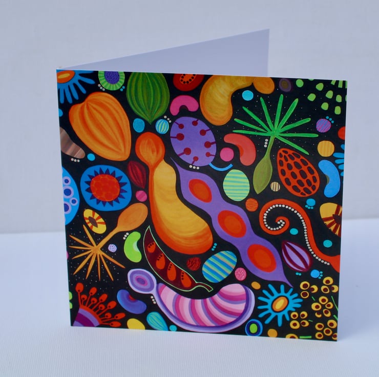 This striking design which includes a selection of seed pods is a high quality reproduction of one of my large acrylic paintings. The card is 12.5cm square and produced on high quality card. It comes packaged in a cello bag with a pristine white envelope.