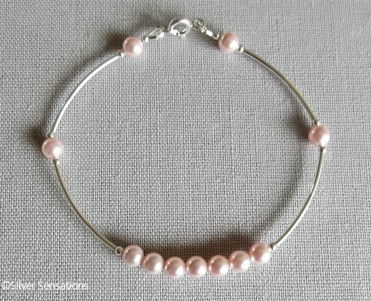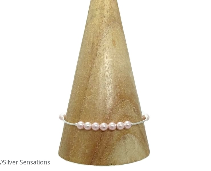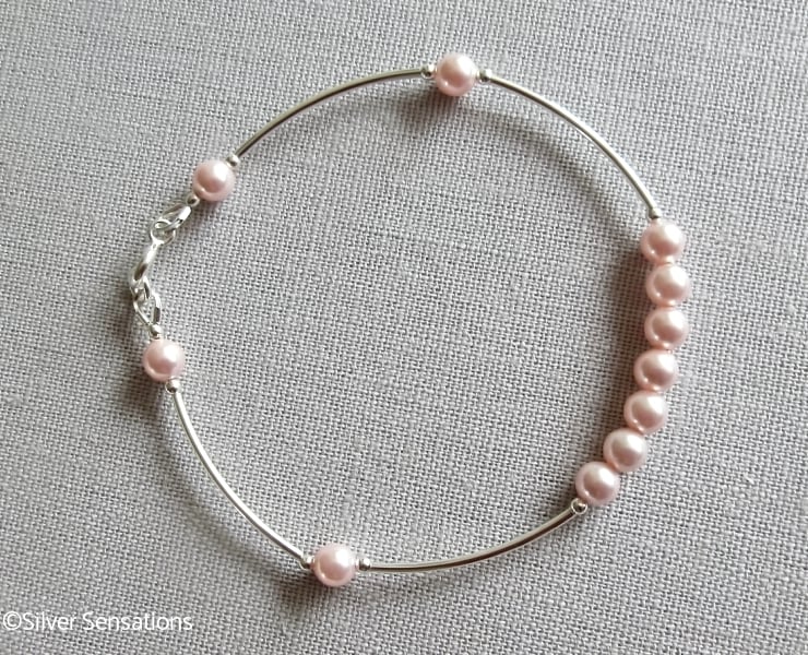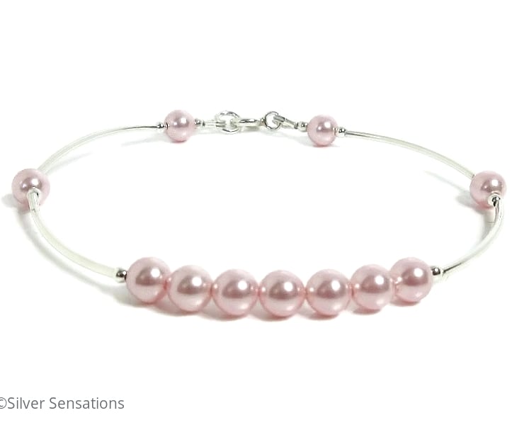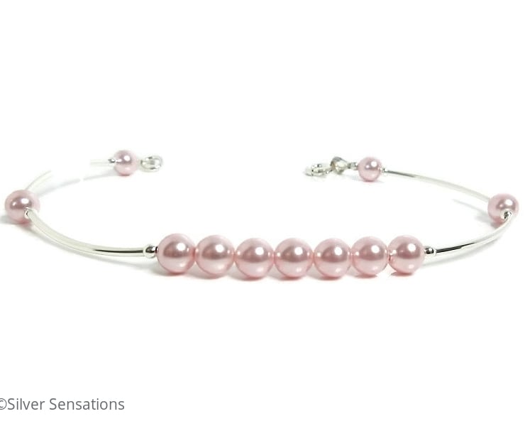 Pastel Pink Pearls & Sterling Silver Bangle Bracelet For Bridesmaids & Proms etc