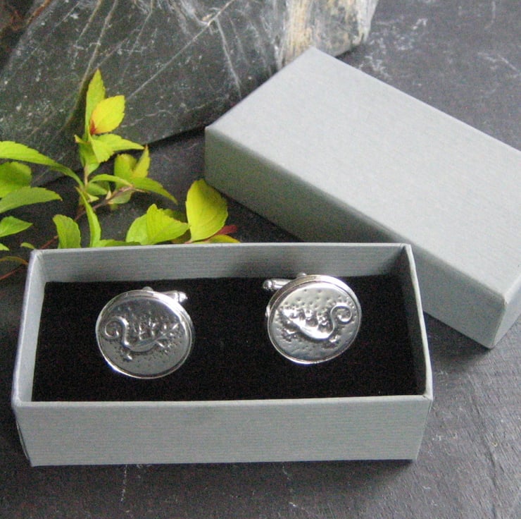 The gecko design is embossed in sheet pewter and mounted onto cuff links.