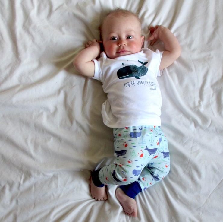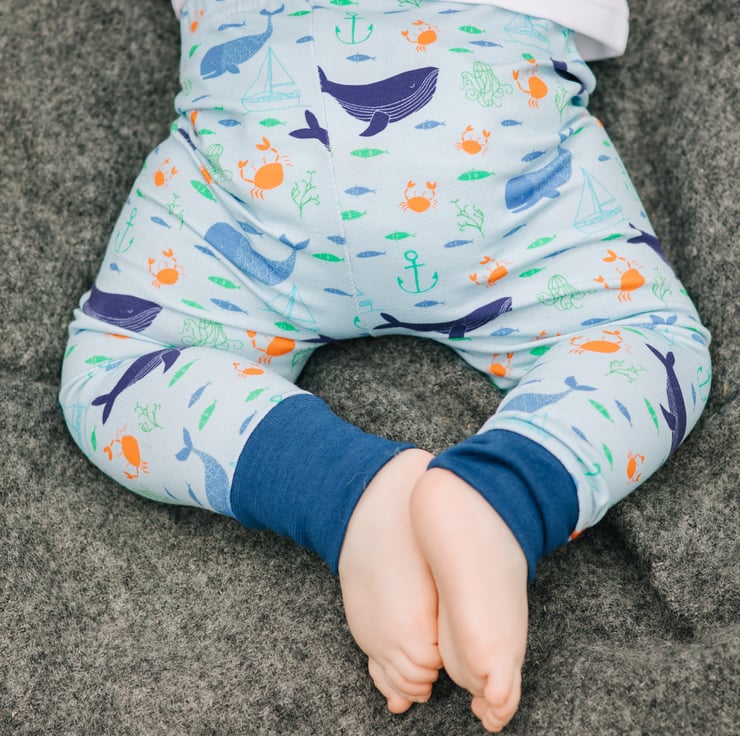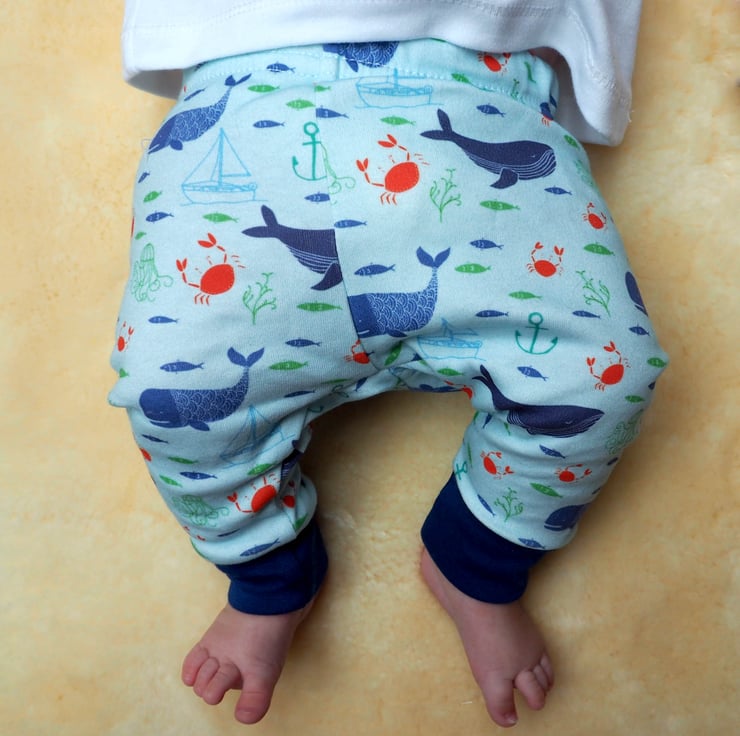 Organic nautical baby leggings. A repeat pattern of whales, jelly fish, boats and crabs, digitally printed onto organic cotton with dark blue stretchy cuffs and an elasticated waist band. Hand made from my studio in Bristol.