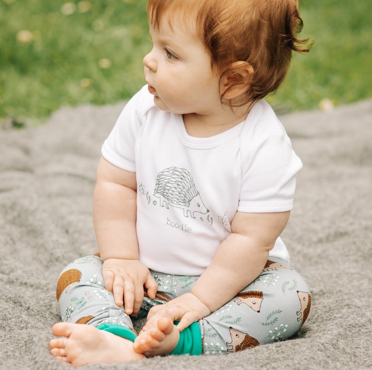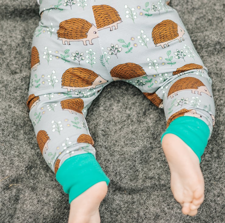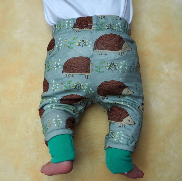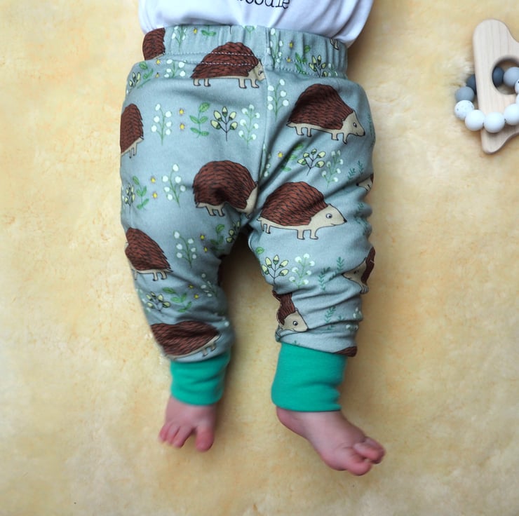 Organic hedgehog baby leggings. A repeat pattern of hedgehogs, leaves and foliage, digitally printed onto organic cotton with bright green stretchy cuffs and an elasticated waist band. Hand made from my studio in Bristol.