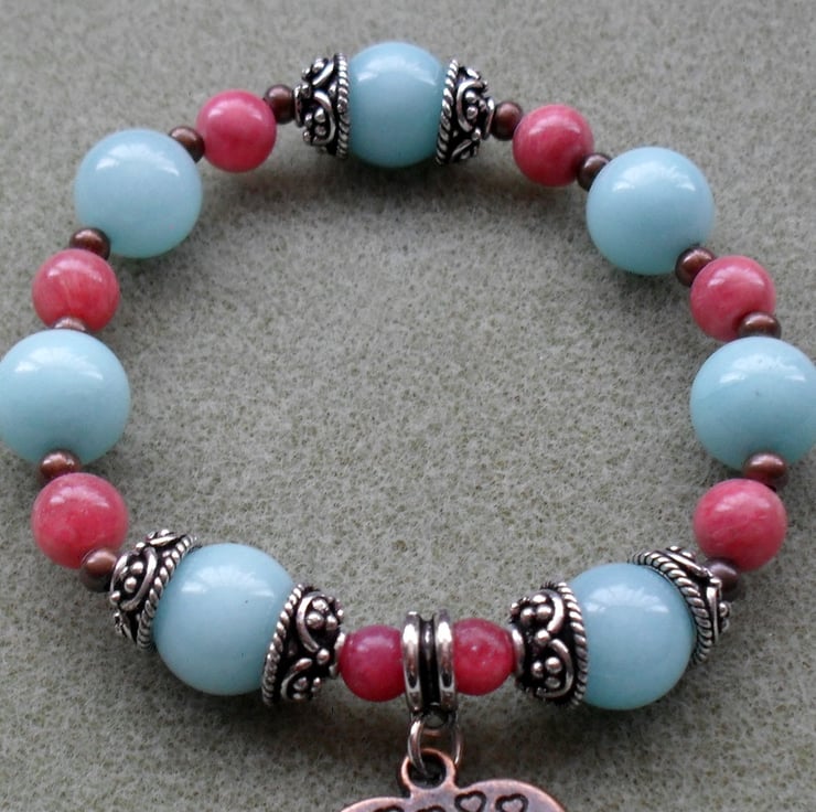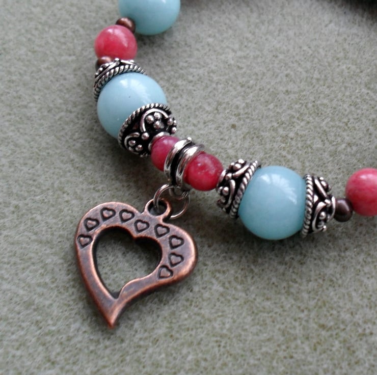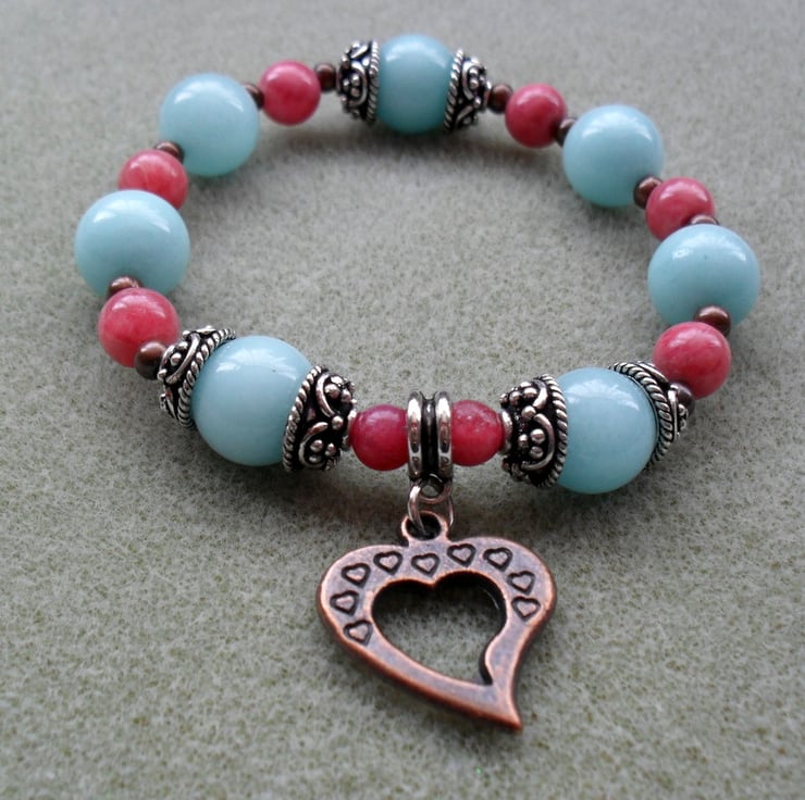 Stretch bracelet with aqua blue quartzite and strawberry pink rhodocrhosite semi precious gemstones,silver tone bead caps and copper coloured brass spacer beads with a copper tone heart charm are beaded onto elastic.
