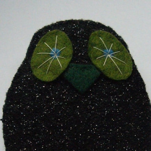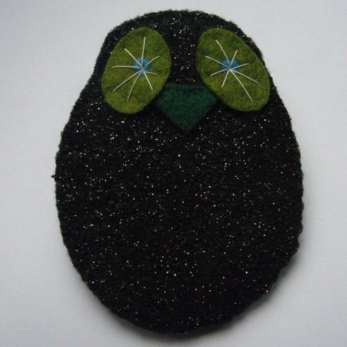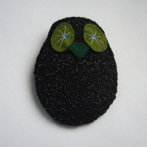 This Owl Brooch is dressed to impress in Black Glitter Felt showing off his HUGE mossy green eyes.