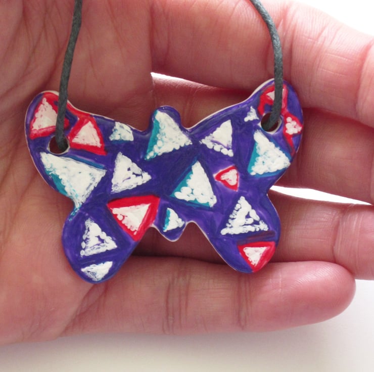 Purple Turquoise and Red Triangle Pattern Hand Painted Ceramic Butterfly Pendant on Grey Cord with Lobster Clasp