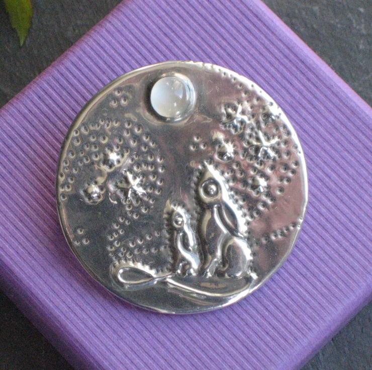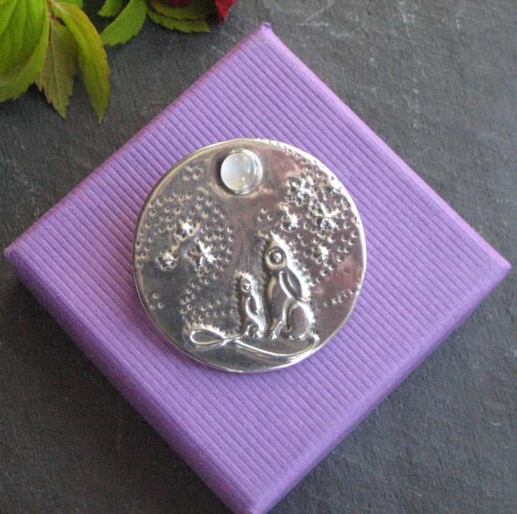 Two moongazing hares with moonstone moon brooch in pewter. This shiny brooch depicts two hares, one large and one small, gazing up at a genuine moonstone moon. This variation on my popular moon-gazing hare brooch was inspired by the phrase "I love you to the moon and back...."
