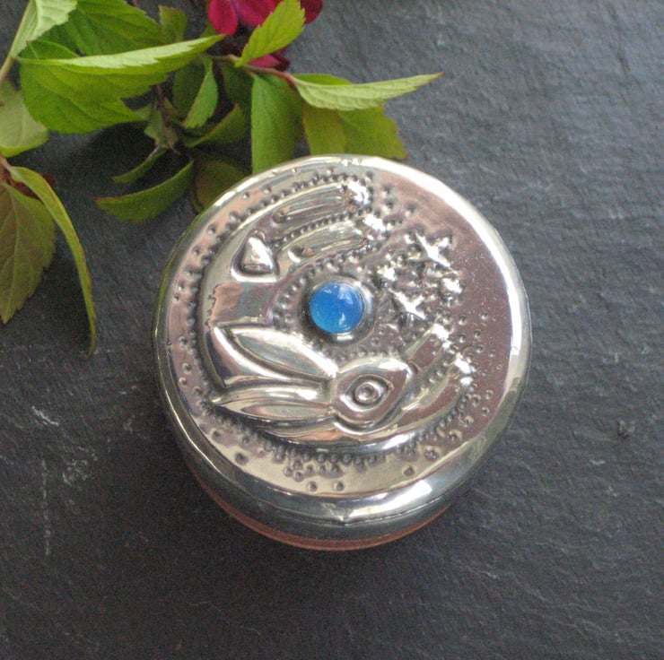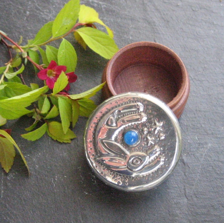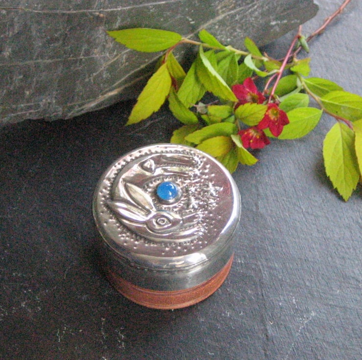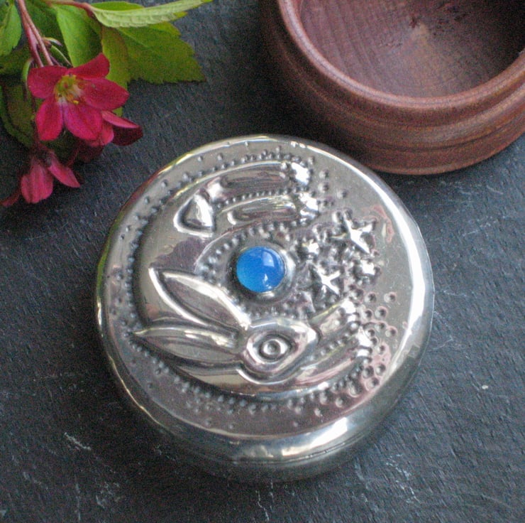 The lid of the box is loose-fitting and has been decorated with a beautiful pewter design of a hare. It has been set with a beautiful blue agate cabochon stone.