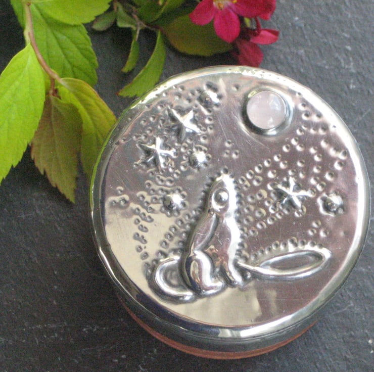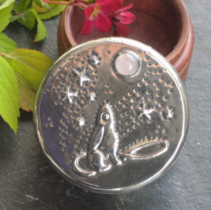 Wooden box with pewter lid, moon-gazing hare design with rose quartz.