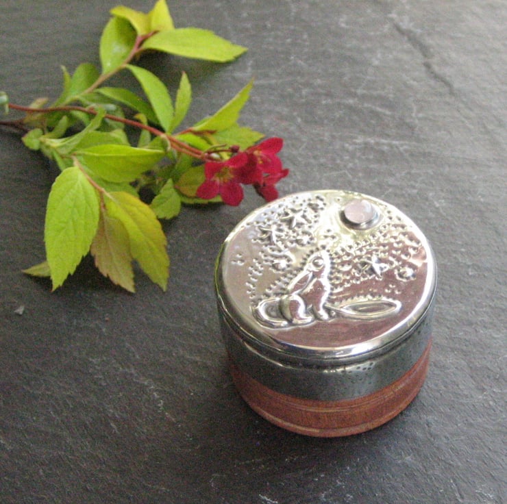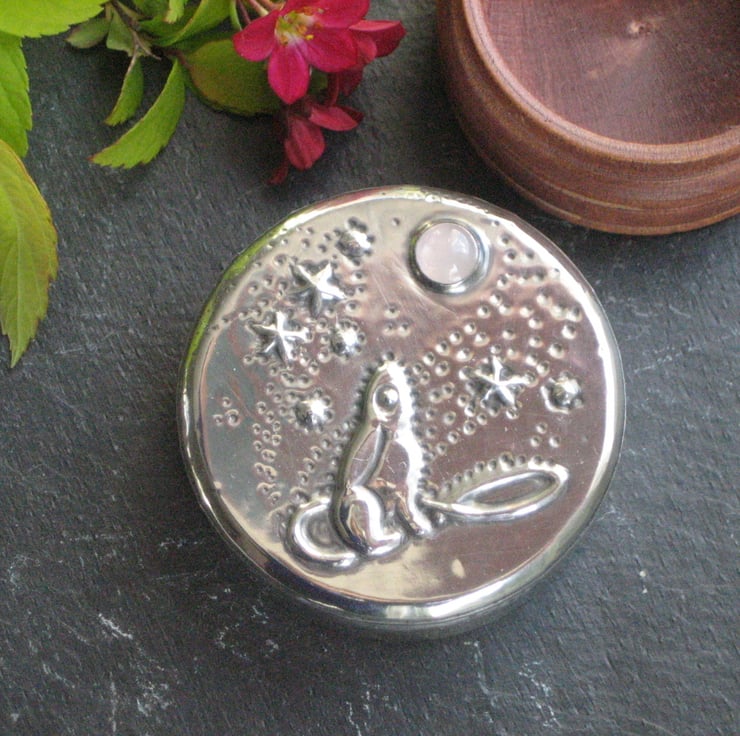 The mythical moon-gazing hare depicted in pewter set with a moon of pale rose quartz. The lid of this tiny wooden box has been hand-decorated to make a unique present for a man or a woman. The wooden box has been lightly stained and the lid is loose-fitting. Ideal for keeping safe your little treasures from cufflinks, rings and buttons to hearing aids.