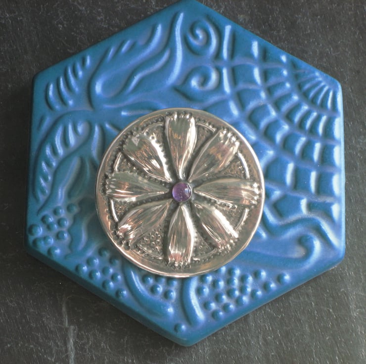 This large but lightweight brooch has been made by hand in lead-free pewter in the Arts and Crafts tradition, using the repousse method. A design is raised on a piece of sheet pewter, the raised area is filled and the article is mounted on a rigid base, in this case an aluminium brooch.