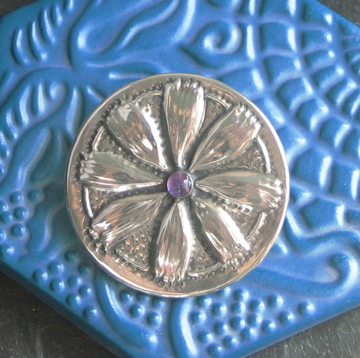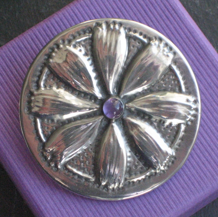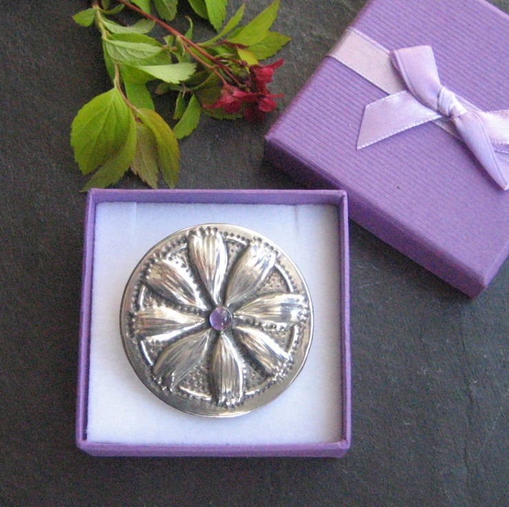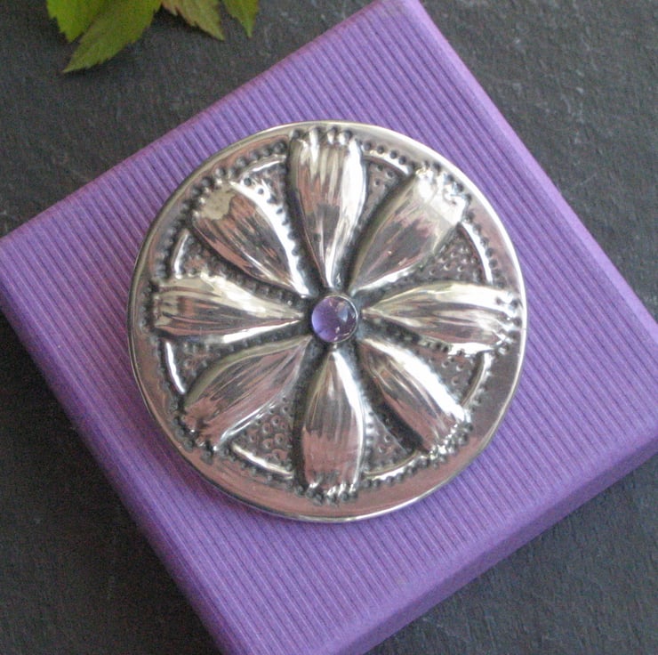 The brooch measures 45mm across and is set with a genuine amethyst. This piece is unique and special.