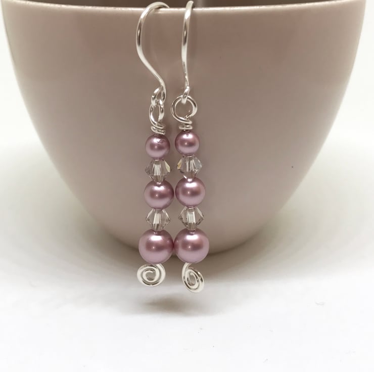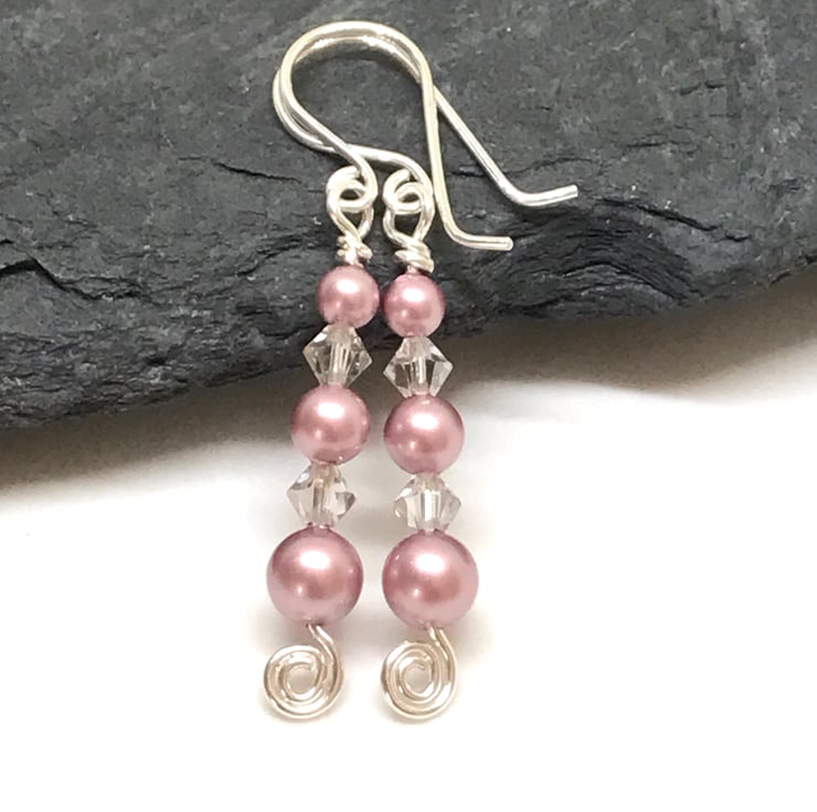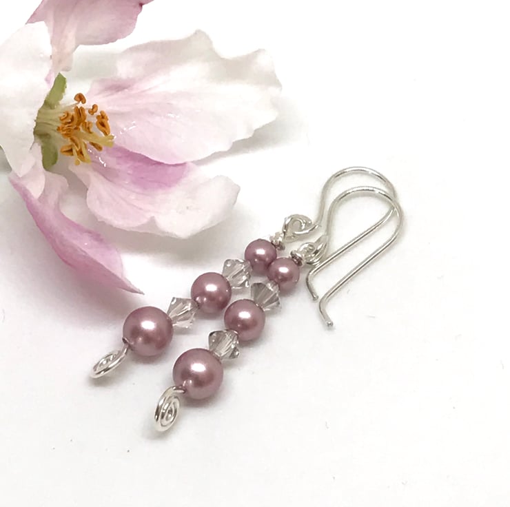 These pretty pink earrings are handcrafted in sterling silver. The pearls are graduated in size 4mm, 5mm and 6mm in beautiful 'Powder Rose' colour with clear 4mm bicone crystals for a touch of sparkle. The ear wires are handcrafted in sterling silver wire.