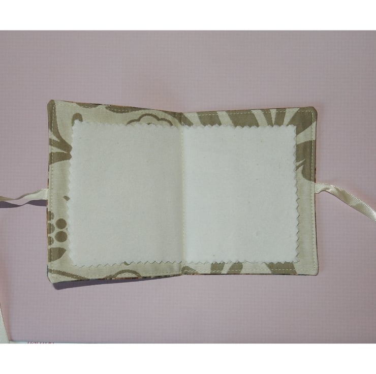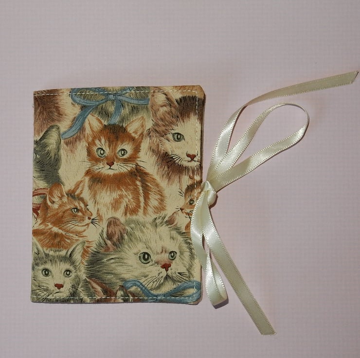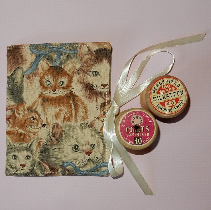 This needle case would be great for cat lovers, it measures approx 4.5 x 3 inches. It is lined in a toning fabric and has four flannel leaves for your pins and needles. It is fastened with ribbon ties, which can be tied right round the case for protection in a bag.