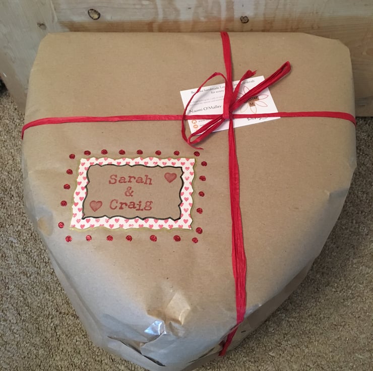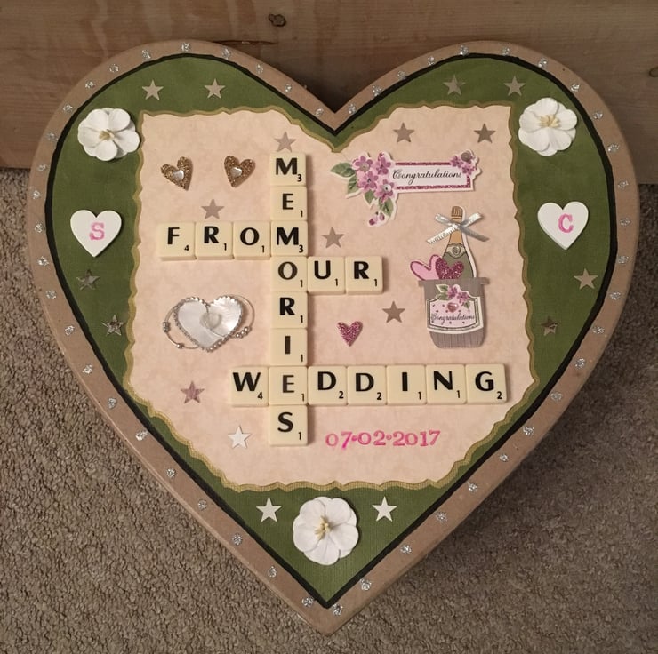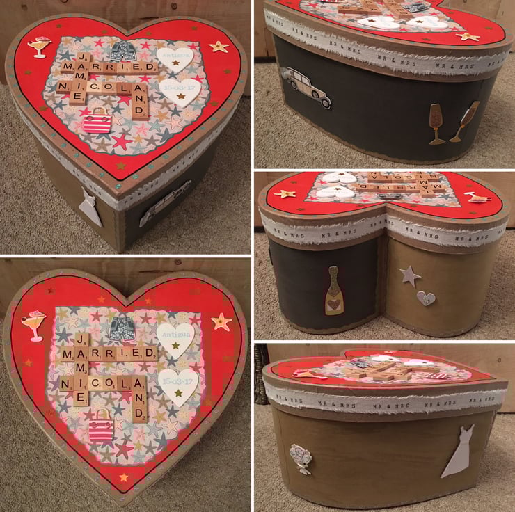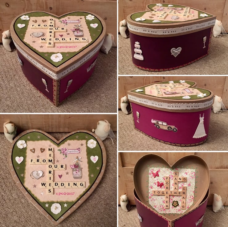 £32 standard/£36 with interior personalised message. Bespoke handmade Scrabble letter mache heart wedding memory boxes personalised to meet your requirements, crafted using top quality materials. The maximum number of letters that can be accommodated horizontally and vertically is 9. Tiles come in the following colour choices; black, white, ivory, baby pink, hot pink, red, purple, baby blue, vintage green or natural wood. A vast number of background card choices are available in numerous colours and designs; please contact me with your requirements to make your design truly unique!